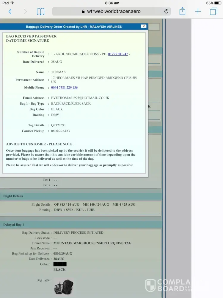 I flew from Darwin - Australia to London Heathrow with a total of three flights. My final flight from Kuala Lumpa to heathrow on 25th August 2017 (flight number MH4) this was delayed for a total of 4 hours. I had to inform a member of Malaysian staff of the delay at Kuala Lumpa airport as he was unaware of the total delay time. In addition to this, once I landed in Heathrow I was surprised to find that my luggage did not arrive. I was later informed by a Malaysian representative that my luggage was unable to be located, while waiting a further 1.45 minutes at the help desk in terminal 4 of the airport to find it was in Kuala Lumpa. The service I received here was appalling and the gentlemen clearly provided false information as I was expecting a follow up phone call the following day for an estimated delivery date as it was bank holiday weekend. After making 14 phone calls and still yet to speak to any human on the Saturday I was later informed that the white luggage tag on my luggage had been 'lost' and had been placed in the wrong container and had ended in Muscat, Oman the following day, Sunday 27th. When attempting to deal and resolve the route of my lugggage I spoke with a lady who's customer service was appalling and later hung up on myself when asked if my luggage would arrive at the beginning or end of the week. Being infuriated at this point, I was yet to know the route or current situation of my backpack.