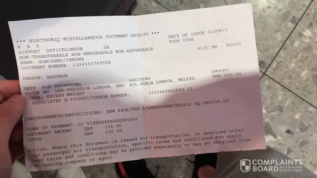 He has one checked in luggage, one hand carry luggage and one computer bag. When ground staff weight the checked luggage and hand carry luggage, total weight for both were 36kg, Your staff was suggested the baggage charges and wouldn't let How Cheng to remove anything out from his luggages and forced and threatened him to wait and not to go anyway and ask him to pay £336 for the excess with his credit card.