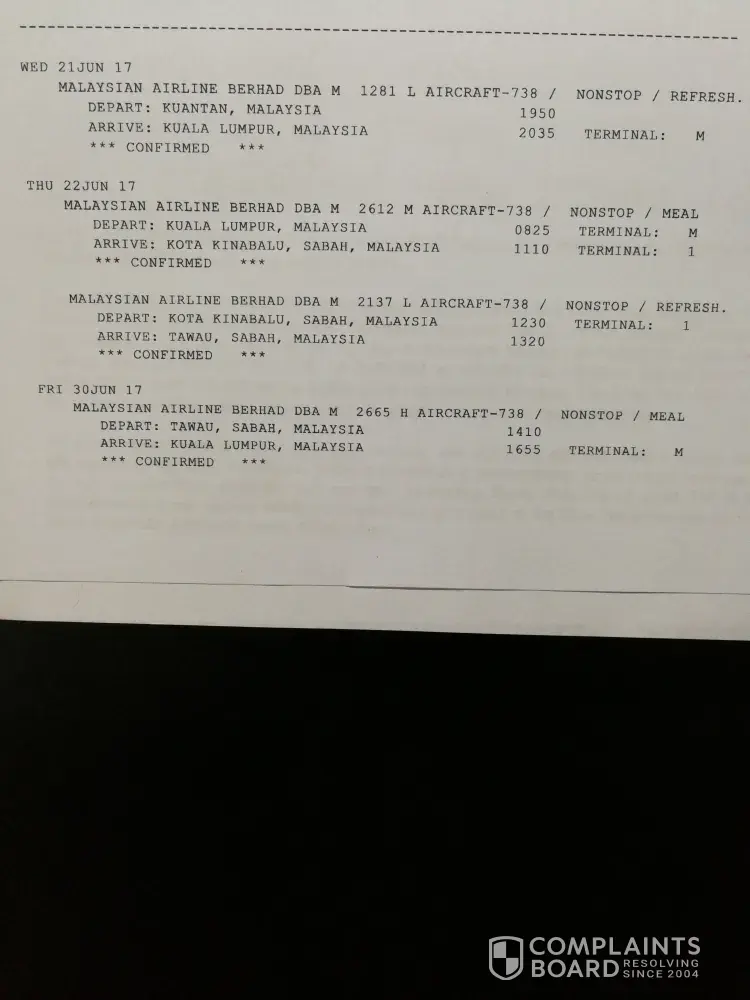 On 3/4/2017, I bought flight ticket for me and six other family members through Travel Agent for sector: KUA-KL @ 6.30am, 22/6/2017 and connecting flights KUL-BKI @ 8.25am, 22/6/2017 & BKI-TWU @ 12.30pm, 22/6/2017.