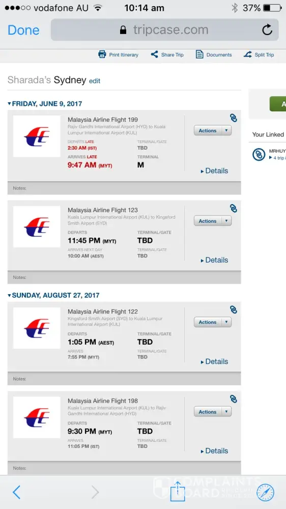 My mother in law was supposed to board Hyderabad at 00:25 and reach Malaysia by 7:05 and I have a connecting flight at 9:05 to Sydney