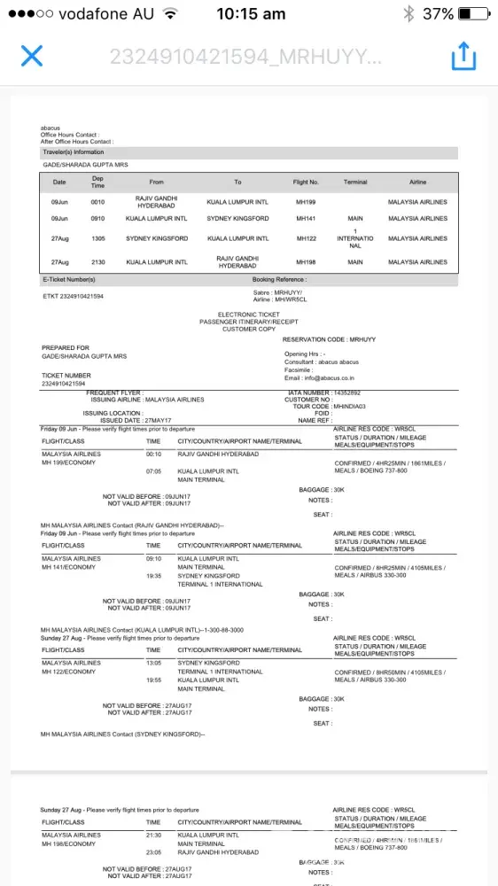 I immediately contacted MAS and I think it was "Julie" I spoke to. I enquired why my bank account was about to be debited with $185. She advised me that this amount was for my return flight from KL to Adelaide on 18th May 2017 in business class and I accepted this explanation. This was when everything went topsy turvey.Â