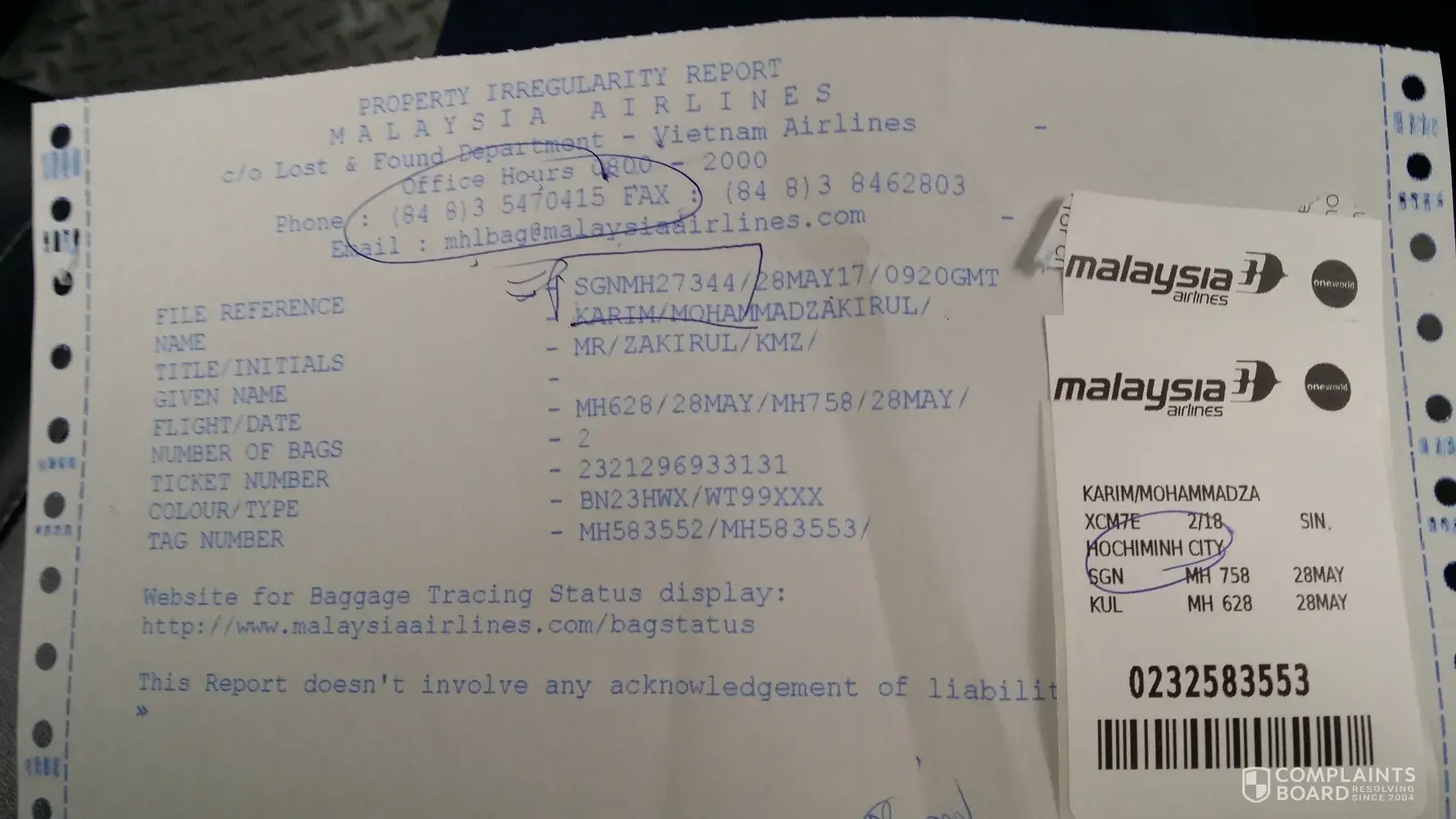 I am travelling from Singapore to Ho chi min city. The flight MH 628 was 20 minutes late and I checked in MH 758. The desk staff confirmed my two laguages [protected] and [protected] was lodge in MH 758. But when I arrived in Ho chi Minh city, both the laguages were not found. I raise lost and found report SGNMH27344.