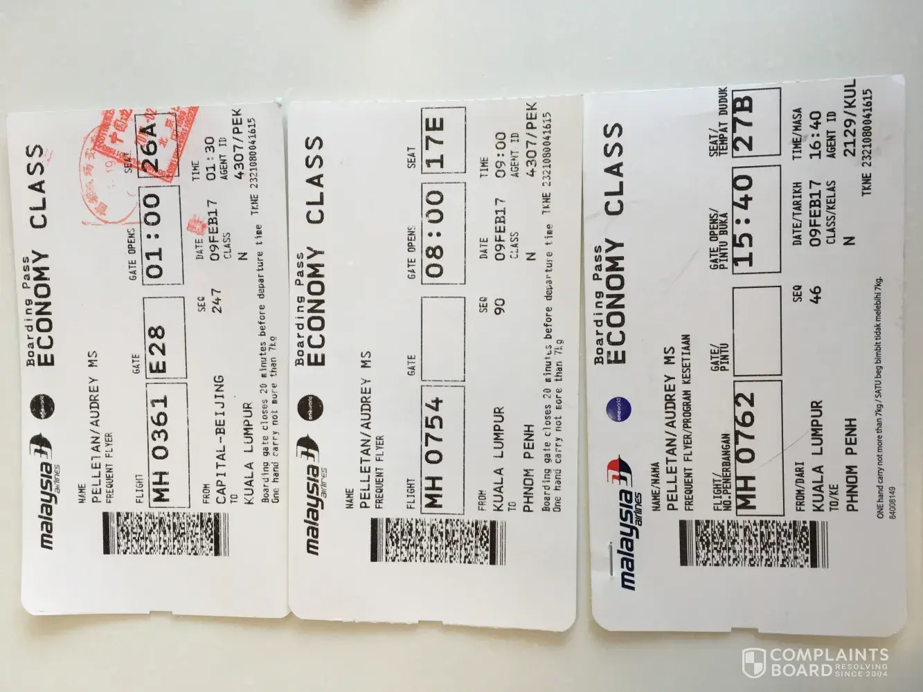 My husband and I took a flight from Beijing to Kuala Lumpur on the 9th of February 1:30 am. The flight has been delayed so we lost our connexion in Kuala Lumpur to go to Phnom Penh. We were supposed to leave about 9am but we arrived in Kuala Lumpur at this time.