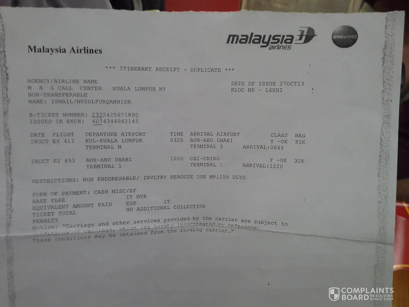 Due to 2nd delay, my flight kl-cairo was forfeited and i being advised by mas staff in penang to approach delay team upon arrival at klia. at klia, delay team issued me etihad airways, ticket number [protected] dated 28th oct 2013, ey 413, kl-abu dhabi at o230 and ey 653 abu dhabi - cairo at 1005. i was instructed by delay team to check in immediately. during check in, i was not allowed to board because my name was not in etihad system. according to check in counter staff, the delay team only booked the seat but failed to provide passenger's details. i was requested to refer this matter back to the mas center, however the mas center was closed at that time. i was advised to wait until the office open. on 28th, i called etihad airways to confirmed my status, and i was advised to refer this matter back to mas center. upon approaching mas center, my flight being replaced by egypt air, ticket number [protected], dated 28th oct 2013, at 2200, ms 691, kl-cairo.