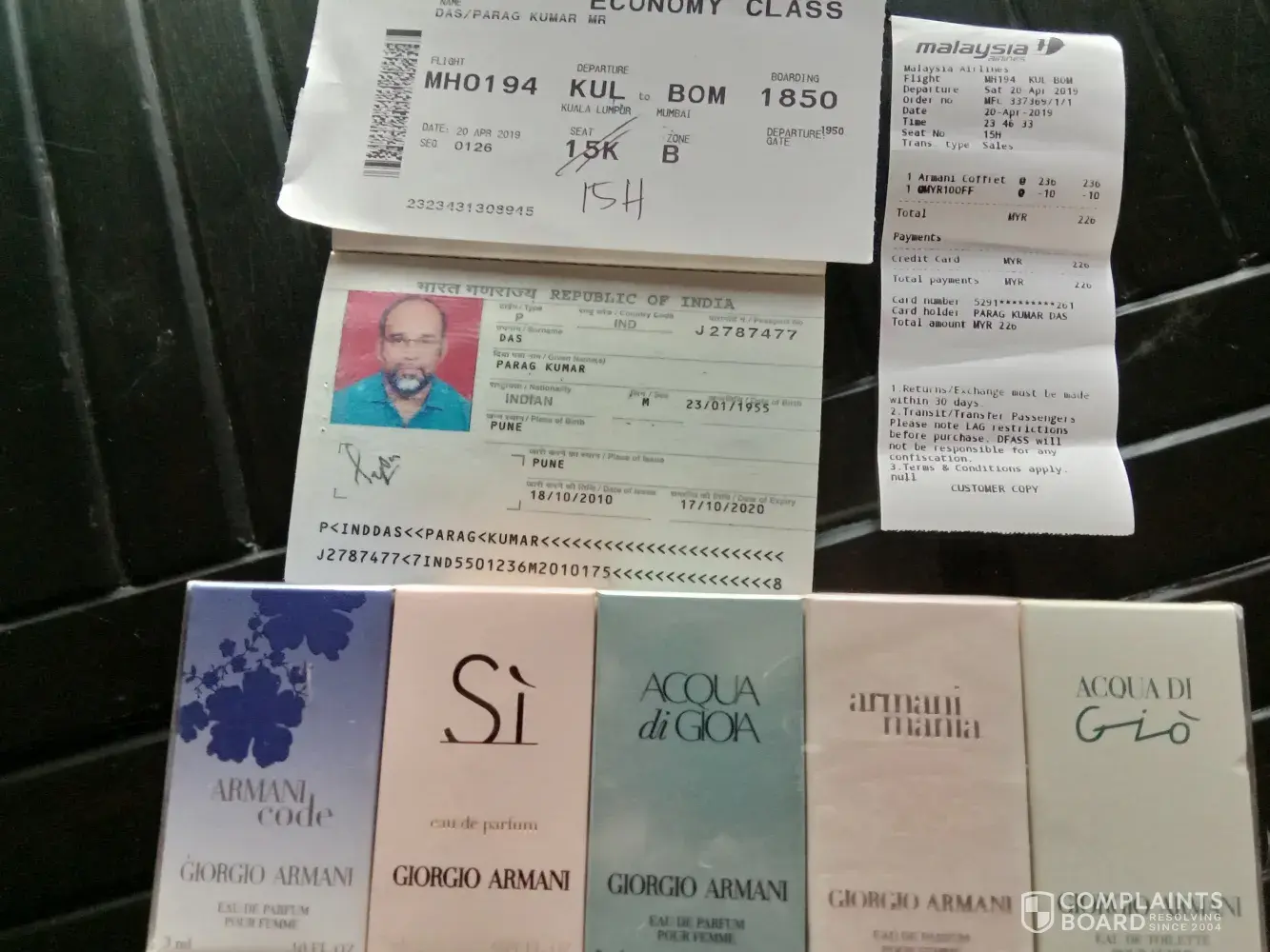 I was travelling from KL to Mumbai on 20th April by Malaysia Air lines MHO 194 . I purchased a GORGIO ARMANI set of perfume for 226MYR