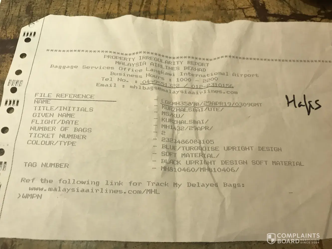 On 01july i called many times and finally at 1530LT a driver from MH reported to our hotel with our bag!