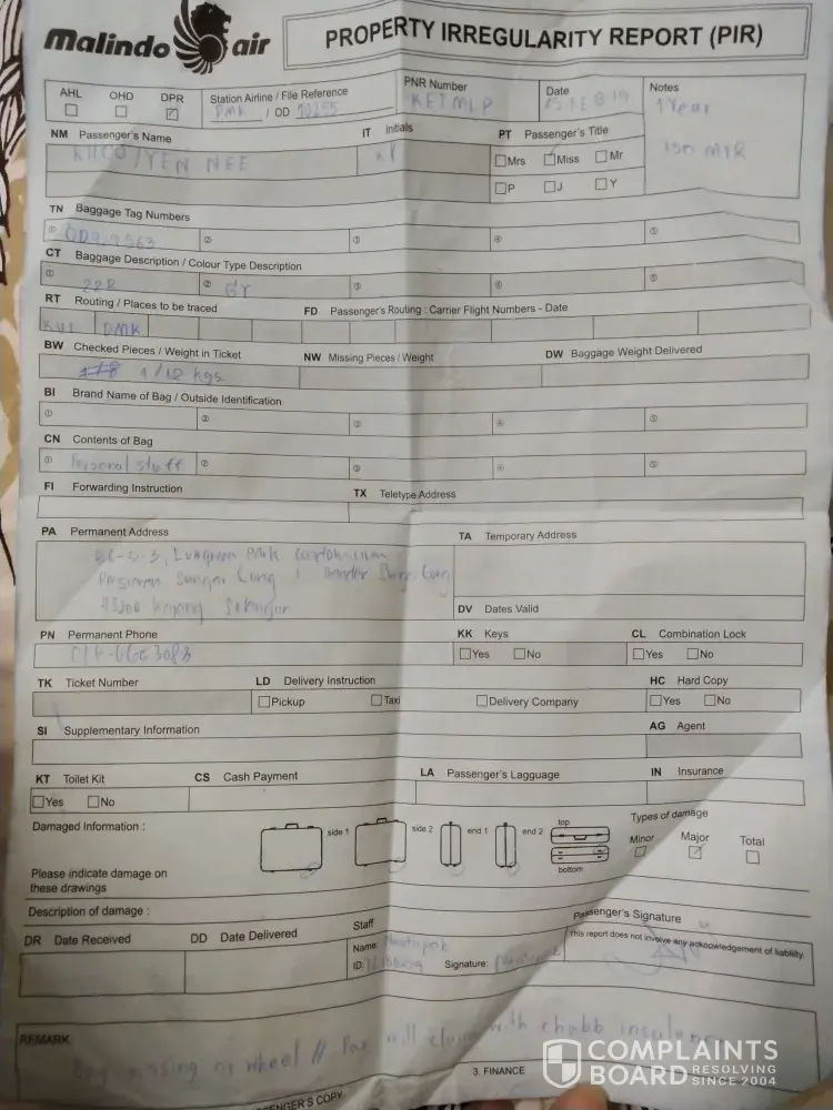My luggage was broken and lost a wheel when I'm landed at Taiwan airport. I could not able to find any Malindo customer support there. My luggage was in good condition when I dropped in Kuala Lumpur. I need to claim for my loss. Please advise this issue. Thank you.
