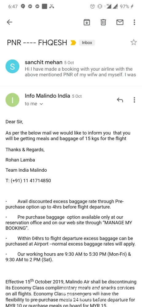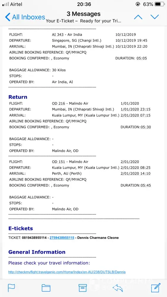 Please find my email to MALINDO customer services dated 12.01.2020 as per below:-