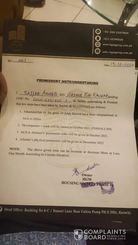 Sehar Enterprises has sold the plot in PKR 32 lacs with documentation charges PKR 25 thousand without development charges. In March 2018 Al Habib Restaurant Owner Mr. Sajjad Kalwad's person Mr Rana Muzammil (cell# [protected]) have taken the charged of the project with the new name HGM Villas and told all the allotee that we had removed the Sehar Enterprises (worked as marketing agency) from the project and claimed its our project without given any written notice.