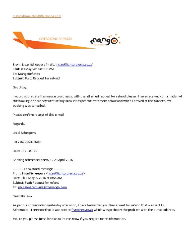 I normally travel between Cape Town and Lanseria airport, Johannesburg via Kulula.com. I had an emergency situation at my office in Jhb on Monday, 09 May 2016 and needed to book a flight the same day. I did book a seat on a flight at 17.00 flying from C.T. International to Lanseria. Flight No. JE716 at a cost of R1, 006.51. I now wish that I had not booked with Mango, but I was limited due to time constraints. However, in terms of cost though they were only a few Rands cheaper and I would have taken a later flight with Kulula if I had known how bad booking with Mango was going to be.
