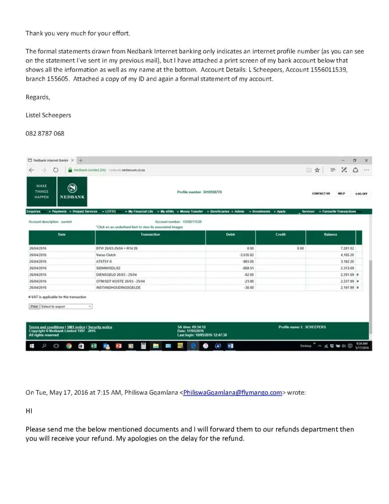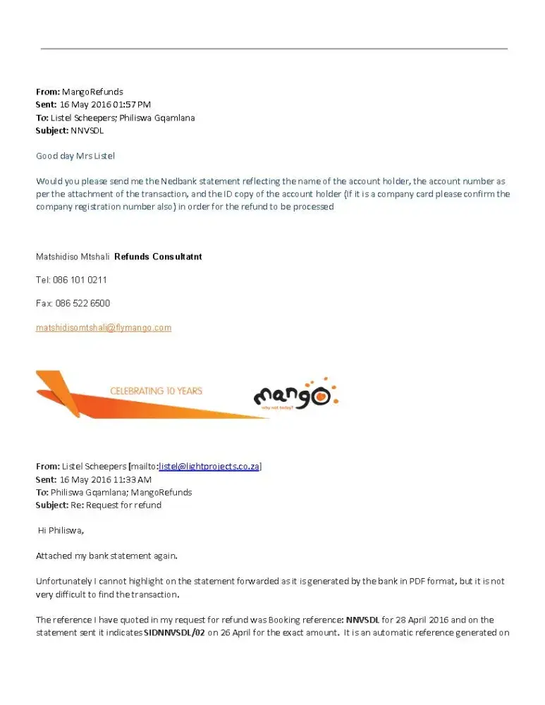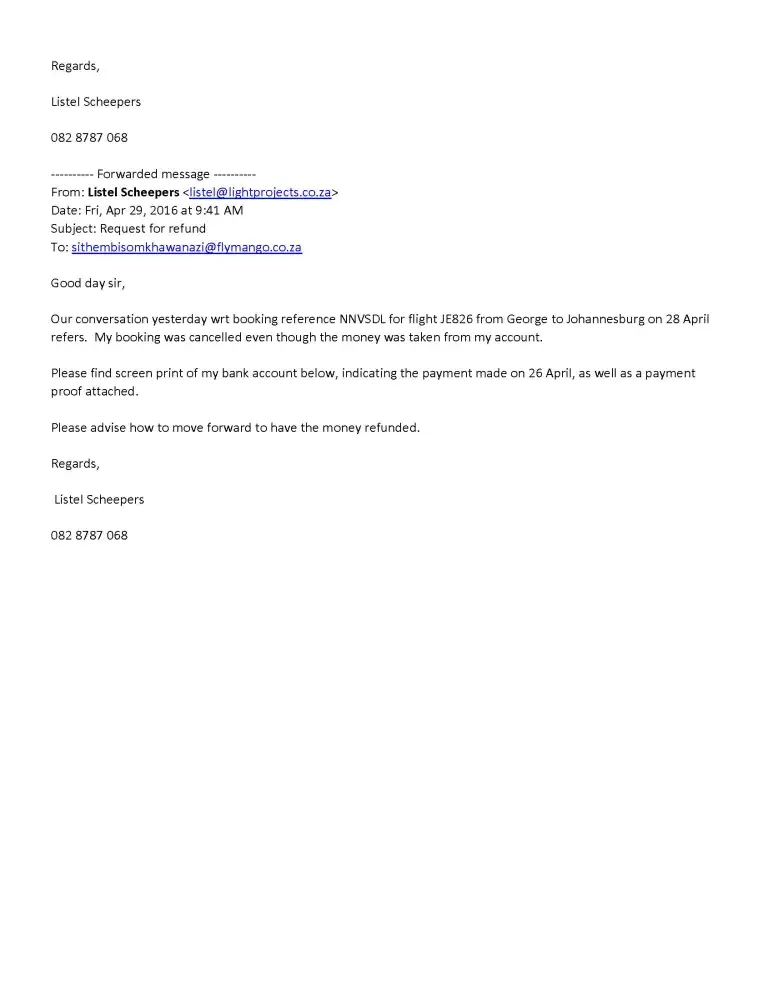 I have booked a flight from GRJ to ORT in JHB on Mango airlines on 26 April 2016. The money was paid EFT through SID and I received a confirmation that the flight was booked. Upon arrival at the airport I was told that my booking was cancelled. I phoned Mango and they asked for a bank statement to indicate that the money went off my account. In order to make the flight a bought another ticket in the meantime. I then proceeded to try and obtain a refund by submitting a clear electronic statement drawn from the Nedbank site, as well as a print screen with the date and reference number of the booking. They first came back and told me they can't find the payment on my statement even though the reference was clearly stated on the statement as well as in the e-mail, with a date that the transaction went through my account. After that they asked for evidence that the account was mine. Nedbank does not provide the name of the account on their electronic statements - only the account number and a profile number. I then explained that and resubmitted the statement with a print screen that indicates my name at the bottom of the screen. They still haven't refunded the money, almost a month later, asking again for a statement with my name on. I refuse to waste my time to go into a branch to wait for a statement with my name on. They don't care who I am - they have all the information on the account that the money came from. Please do not book with Mango - it was my last time