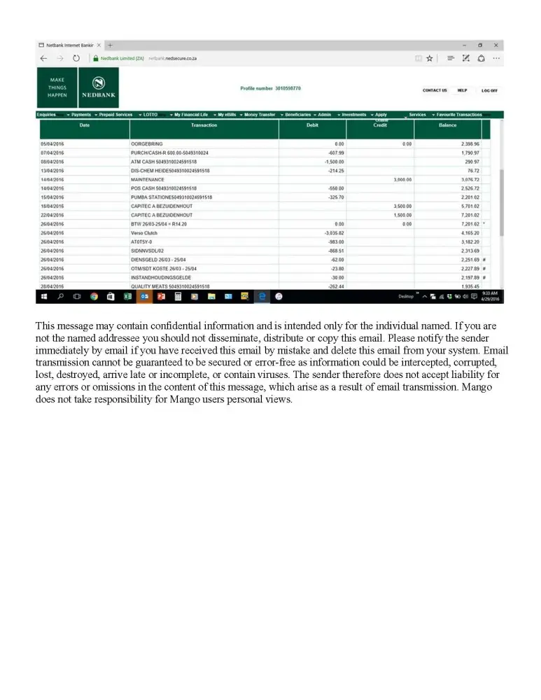 I was told to go down to FNB and get a bank statement, after half an hour I returned with statement in hand only to be informed that it was not that payment that needed verification but the other one. I had put this payment on my Edgars card (this is a service promoted by mango).