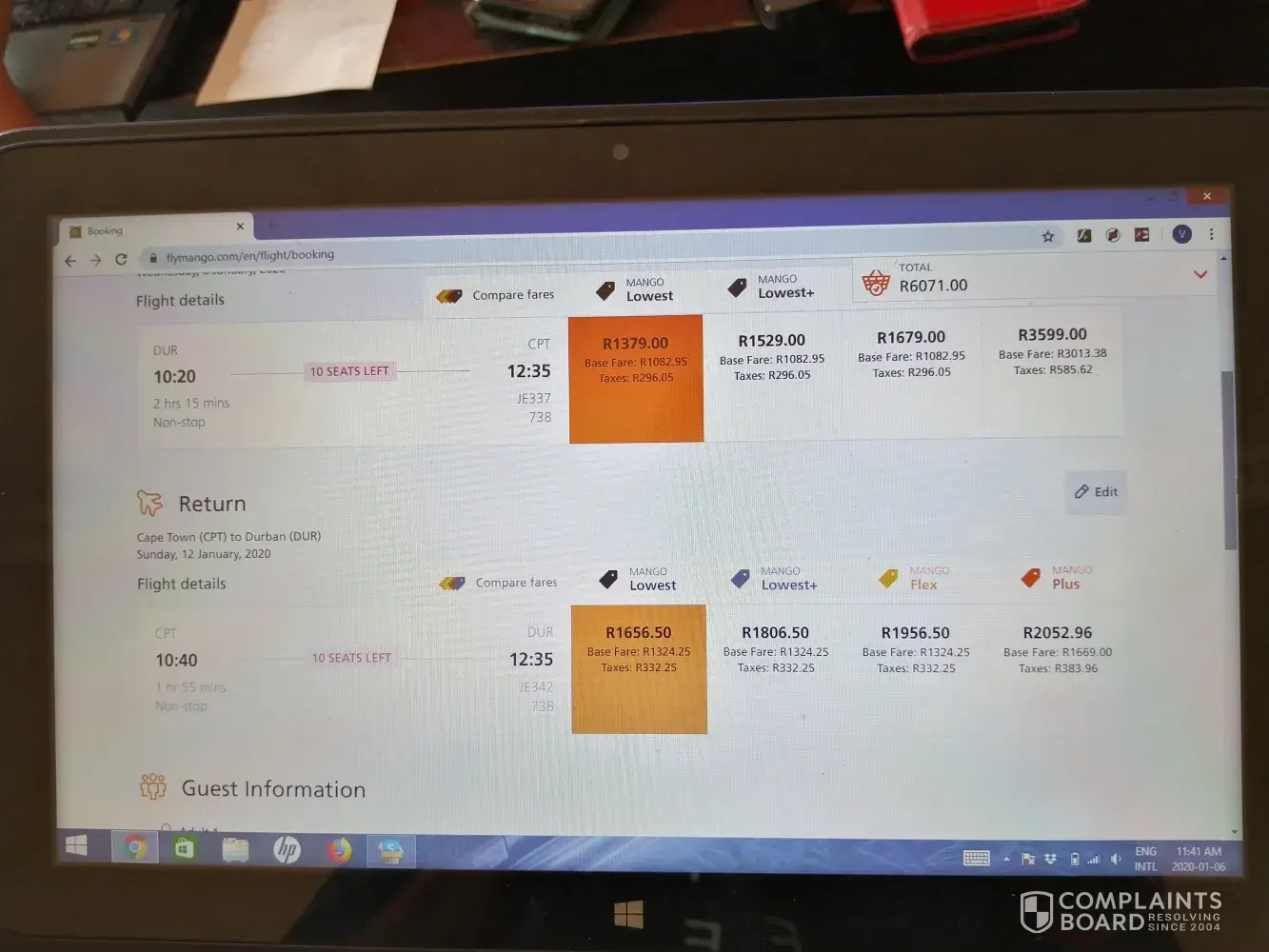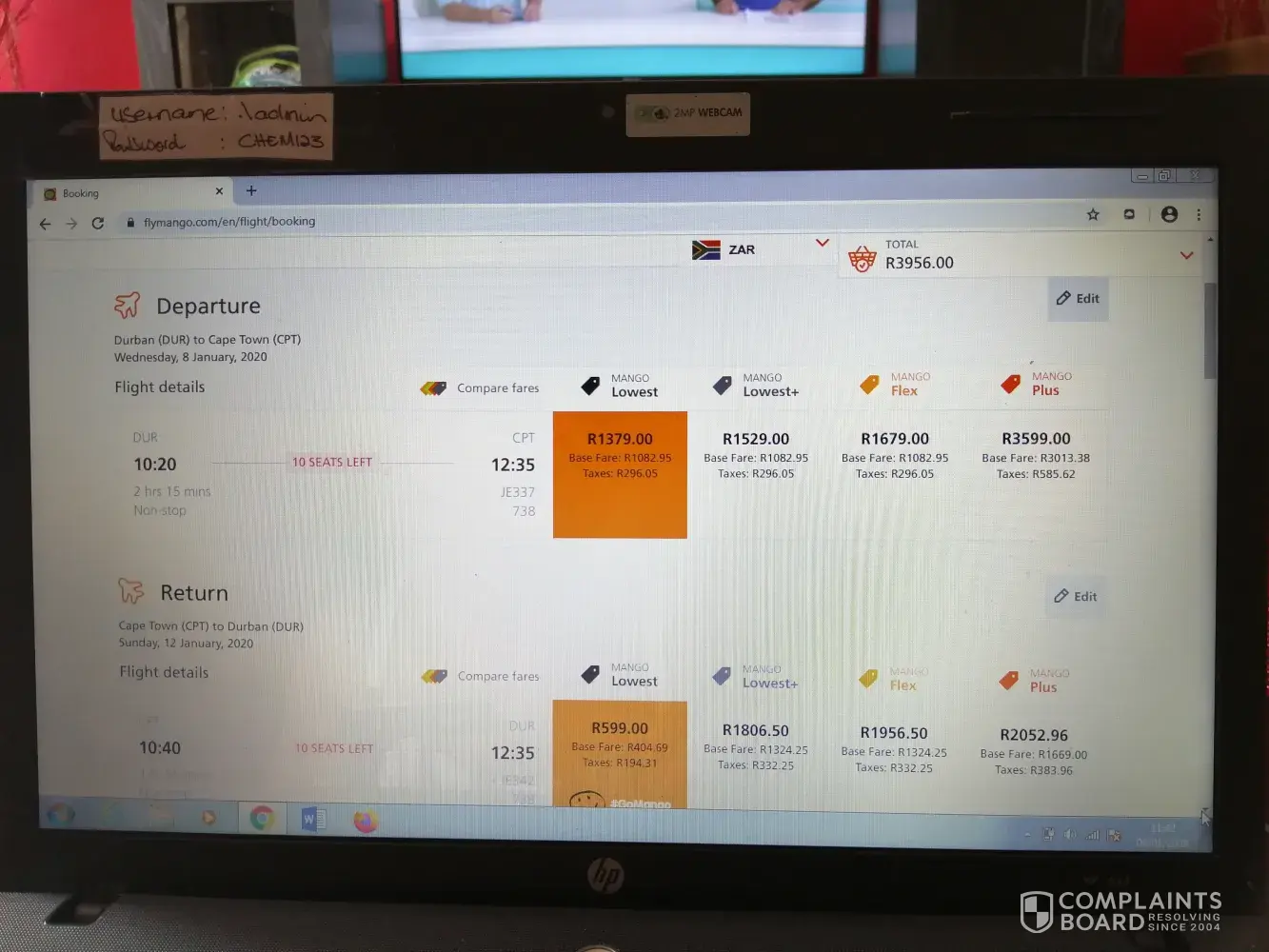 I was trying to book flights for 2 adults, leaving Durban on 8 Jan 10:20 flight R1379 and returning 12 Jan 10:40 gomango low fare R599 bringing the total to R3956, but when I make payment it says flight sold out.