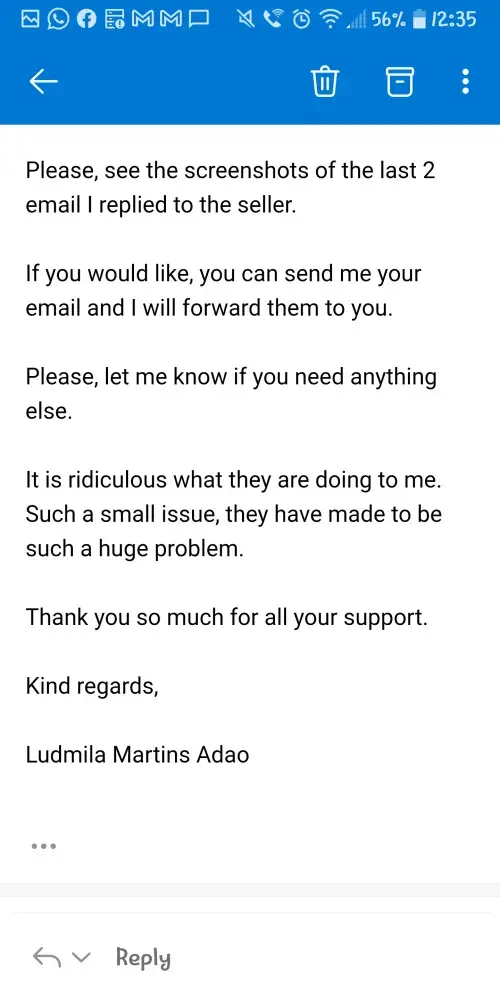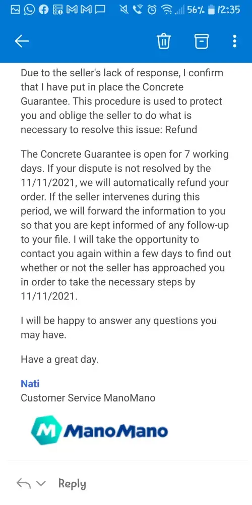 On the same day, I called ManoMano again, to say that I have not received a confirmation email for my refund. I was told by a gentleman (who I did not get his name) that he "can see it; it is just waiting for the supervisor authorisation". I asked him how long it would take, as I need my money and he replied "not too long", and I was certain that my refund would be processed and this issue would finally be resolved.
