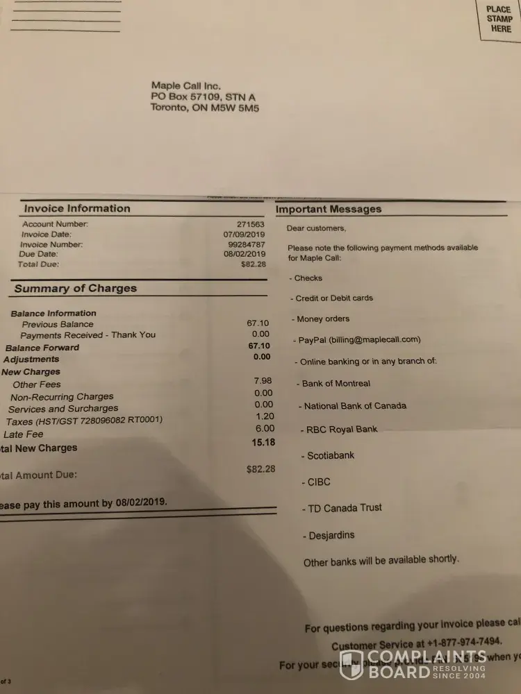 I am a former Blue tone customer and without any consent I became Maple call customer.First email from them was in April 2019, when I answered them that I don't want their services.After 1.7 years ( Nov 2020) they sent me emails telling I have to pay $ 319( 69 in phone calls, and late fees + other charges the difference) I asked invoices, they sent it and some numbers I don't recognize at all. The total amount for effective calls =$7.09.There is no HST# on the invoices.