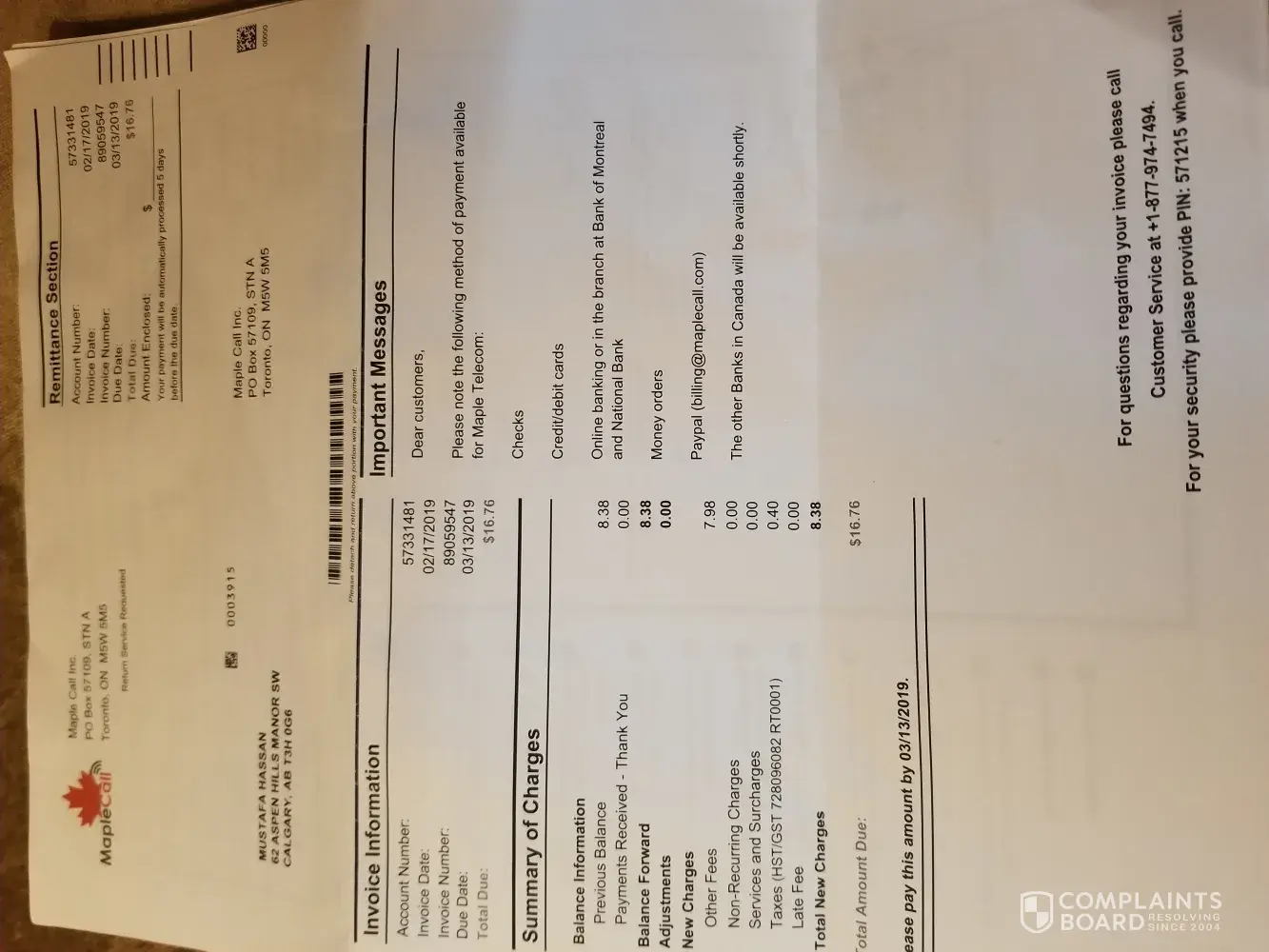 In January, invoice came from Maple Call (?) with a total due: 18.53Cad but Amount Enclosed: "DO NOT PAY ", two months later another bill from Maple Call that I owe them 36.98Cad, after a quick research on Google, found out that Maple Call took over NECC customers (I guess previous customers as well) .