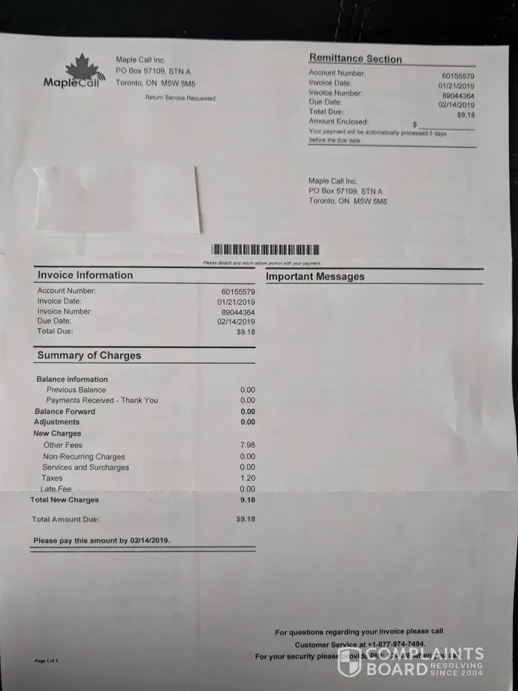 I just received an statement for the company MapleCall (invoice number [protected] / 02-0-2019)saying that I owe for this company $9.18 $.