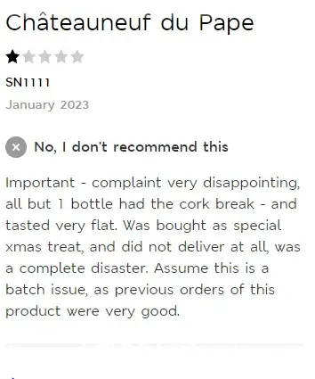 My partner brought a £25 bottle of Chateau Neuf du Pape as a treat(far more than we would normally pay for a bottle of wine). On pouring the wine looked thin and on tasting the wine was very acidic and vinegar like. We have had £4.99 bottles from Aldi that taste much better!...This is especially disappointing as we value marks and spencers as a quality shop and have had wine around the £10 mark from there which has been very good. Please see attached picture of wine plus some of the other disappointing reviews on this product. We had no other wine to entertain with so were forced to drink this so can not return