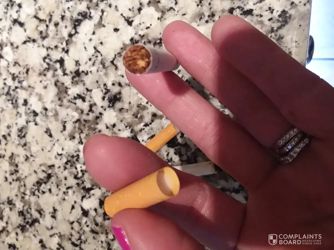 I bought a pack of cigarettes today upon opening I notice the first one I pull out has a filter burn though the whole filter I inspect to check for anymore defects I found 3 like this . I've never had this experience and I'm pretty upset over it shocked really I've smoked Marlboro of some kind for many years and I've like this resolved if possible.