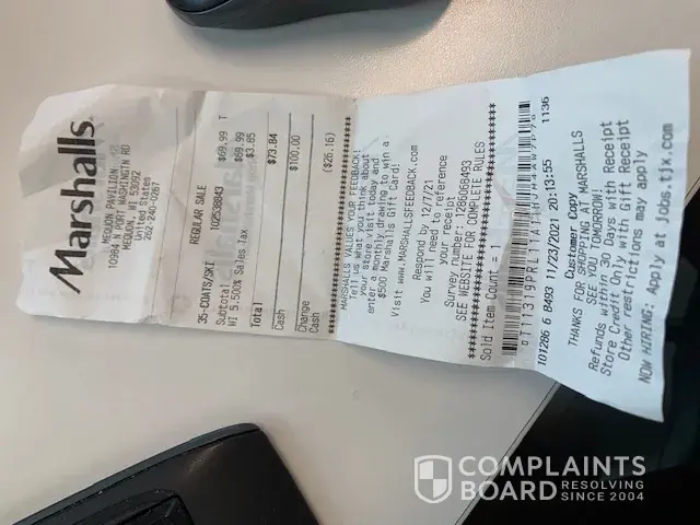 As a long time customer of all of your stores, Marshalls', HomeGoods and TJ Maxx I am sorry to have to write about a disappoint in how a situation for me was handled.