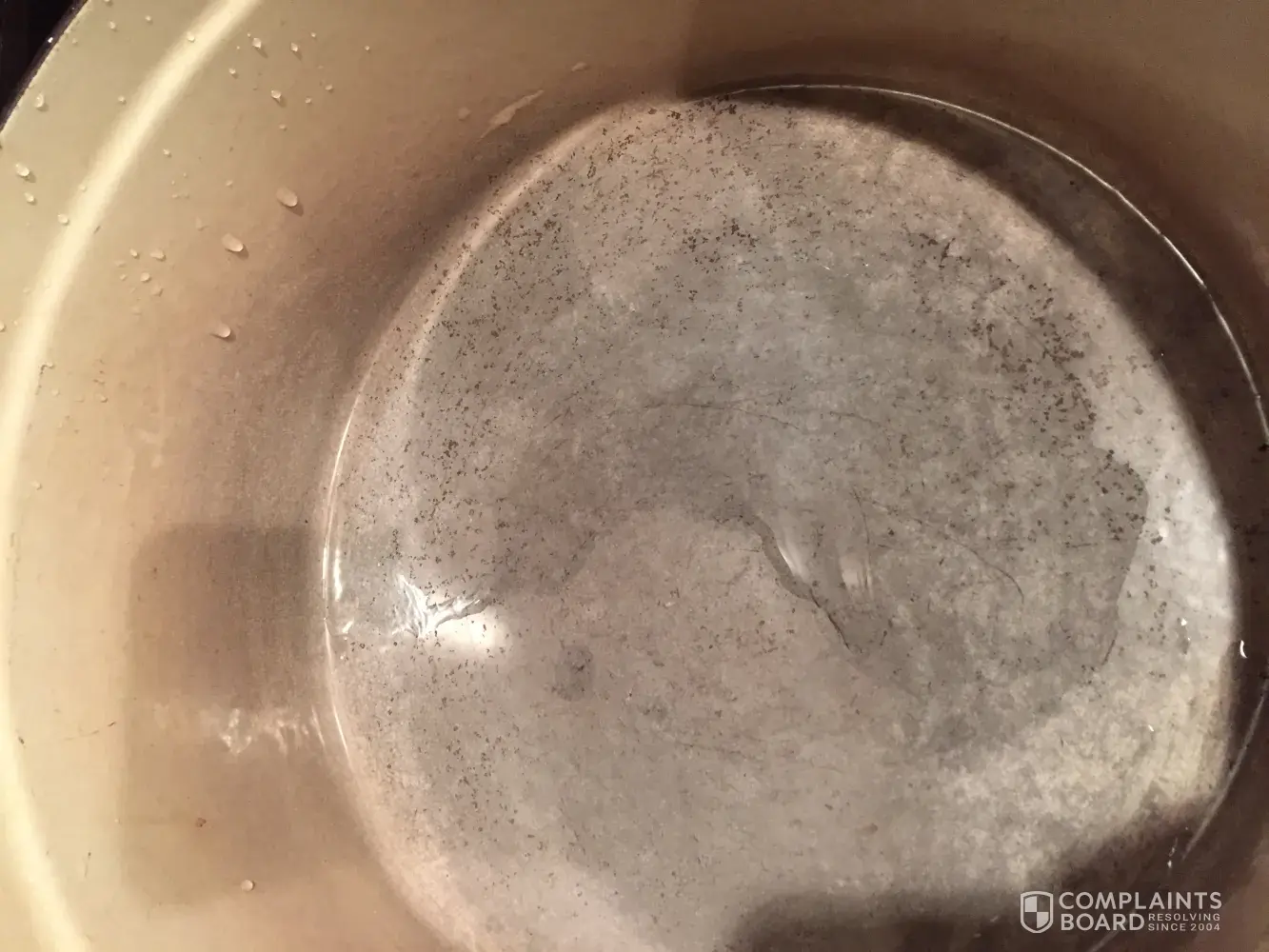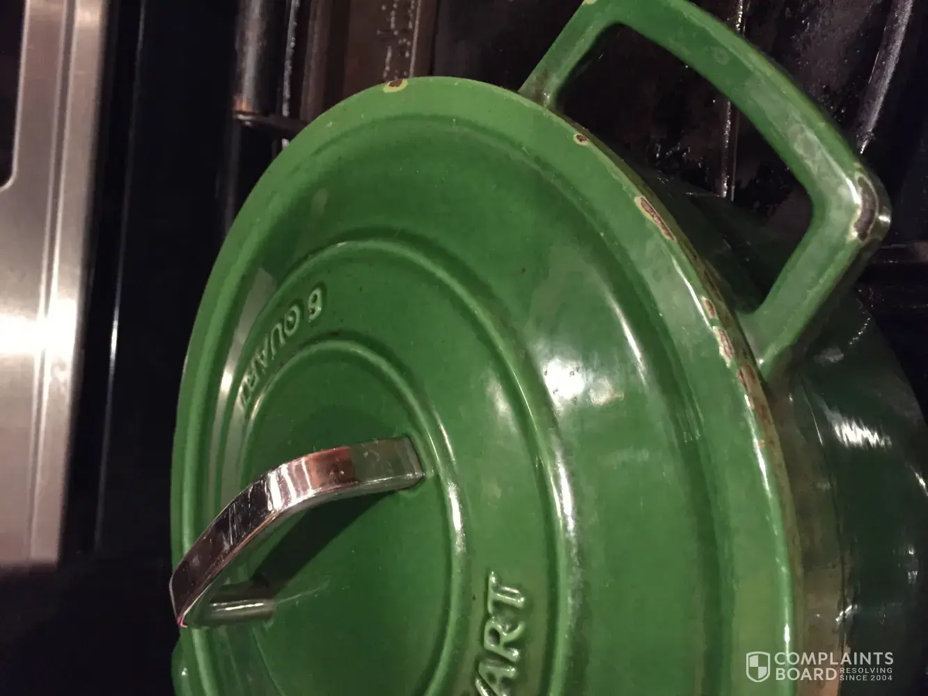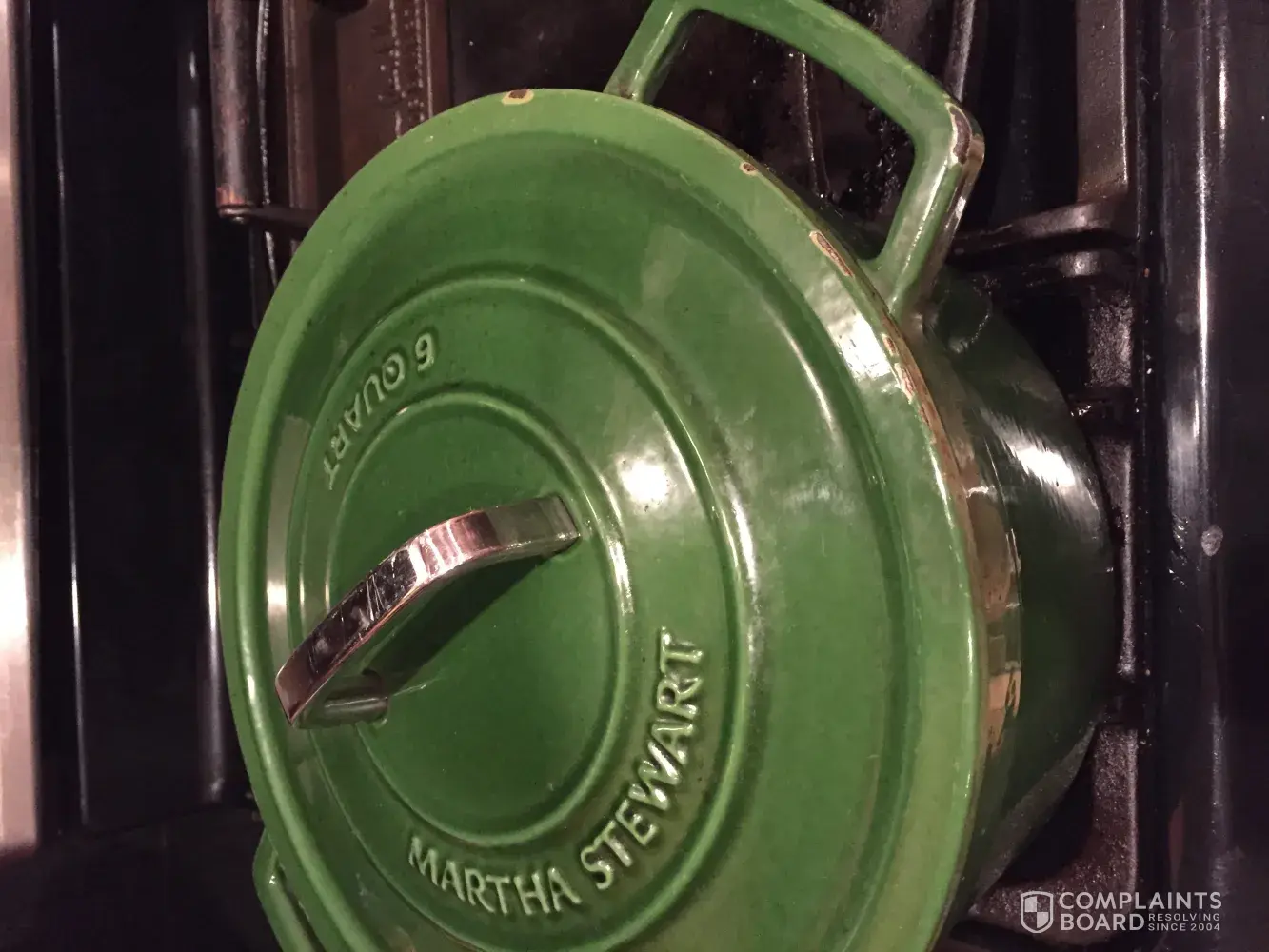 I have a Martha Stewart Dutch oven pot. Color is green. I have not used a lot but looks like it has been. That's not the complaint. I cooked a meal in this pot as I have prepared several times before. I noticed a weird taste. I washed and dried pot. While drying I almost became ill from odor from pot, seems color is coming thru, and a chemical smell.