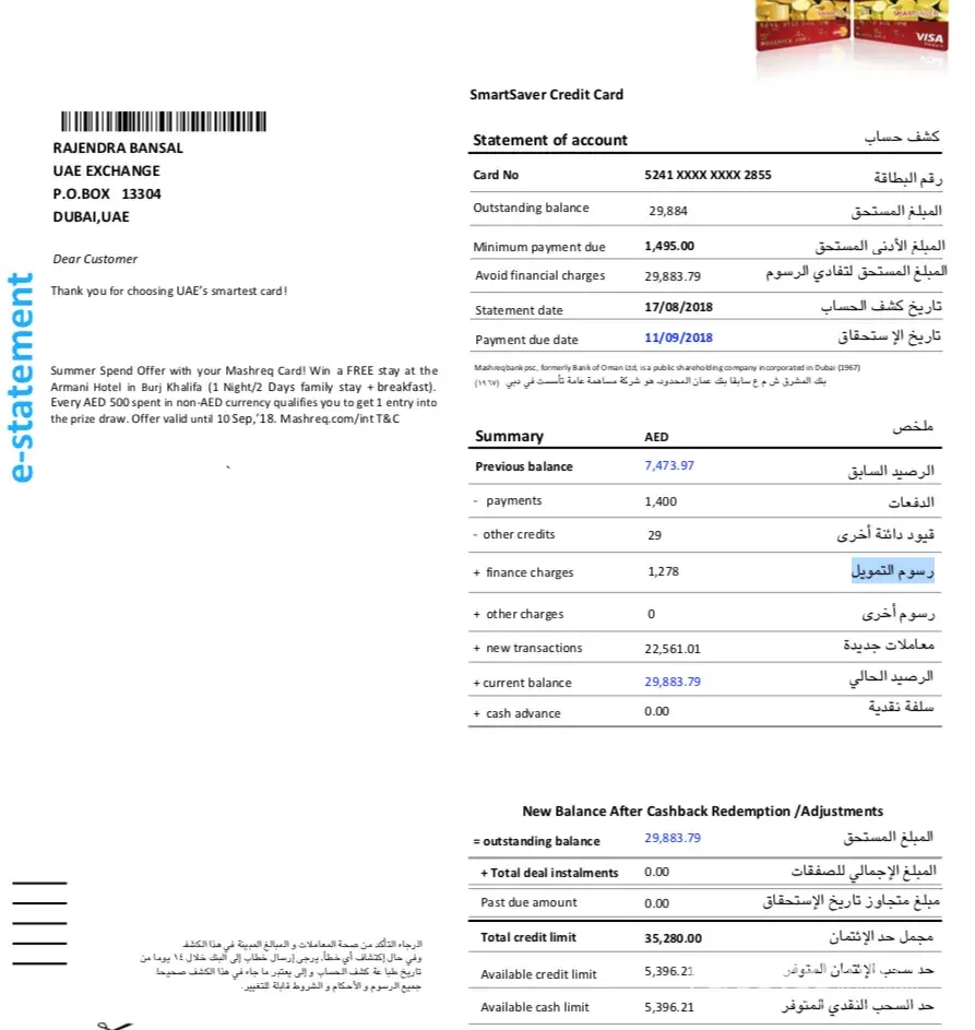 I've been using Mashreq credit card for past 4 years without a single delayed or default on a payment. I was in India on holidays for the month of July and August and I forgot to pay my dues of 5000 before the due date. New statement was generated on 18th of August and instead of the penalty on the 5000 they have charged me interest for 29883. They put the interest on amount which isn't even due till September 11. This is completely unethical behaviour. My request for reversal was also turned down saying that it was with the bank policy. Why would I have to pay interest for amount which isn't even due until next month? i've attached my statement for reference and look forward to your support to have this issue resolved.