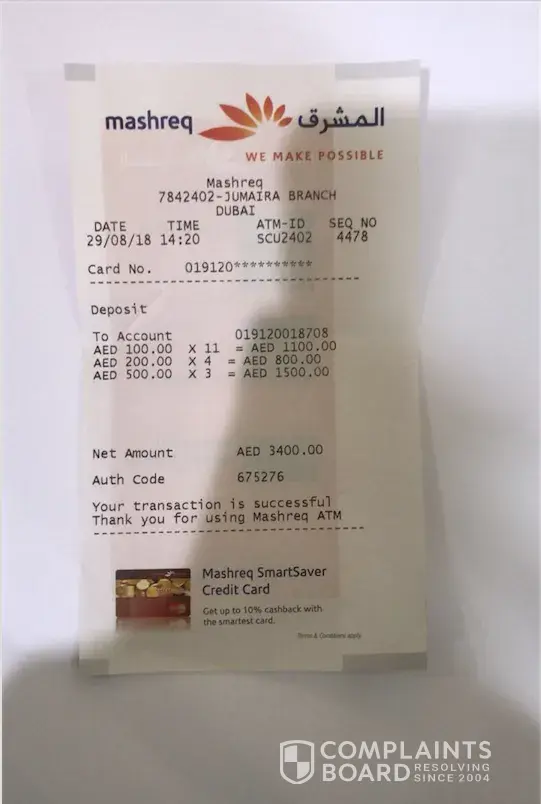 I made the deposit in the Jumaira Mashreq bank branch cash deposit machine . The ATM ID is SCU2402.
