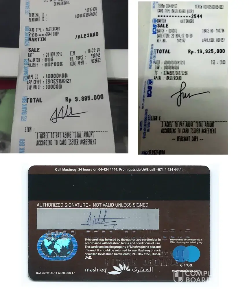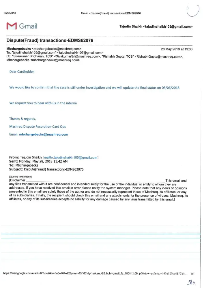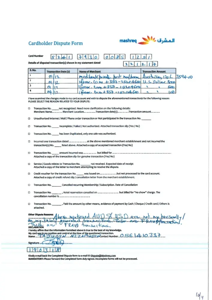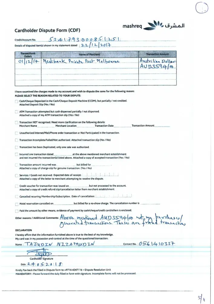 2 weeks later I received the "evidence", and I could verify what I knew, both signatures were not mine. However, every attempt I have tried to get more info from Mashreq regarding the policy for fake signatures, I get no response from anyone involved. I just received a message that reads between lines: Investigation completed, you pay, deal with it.
