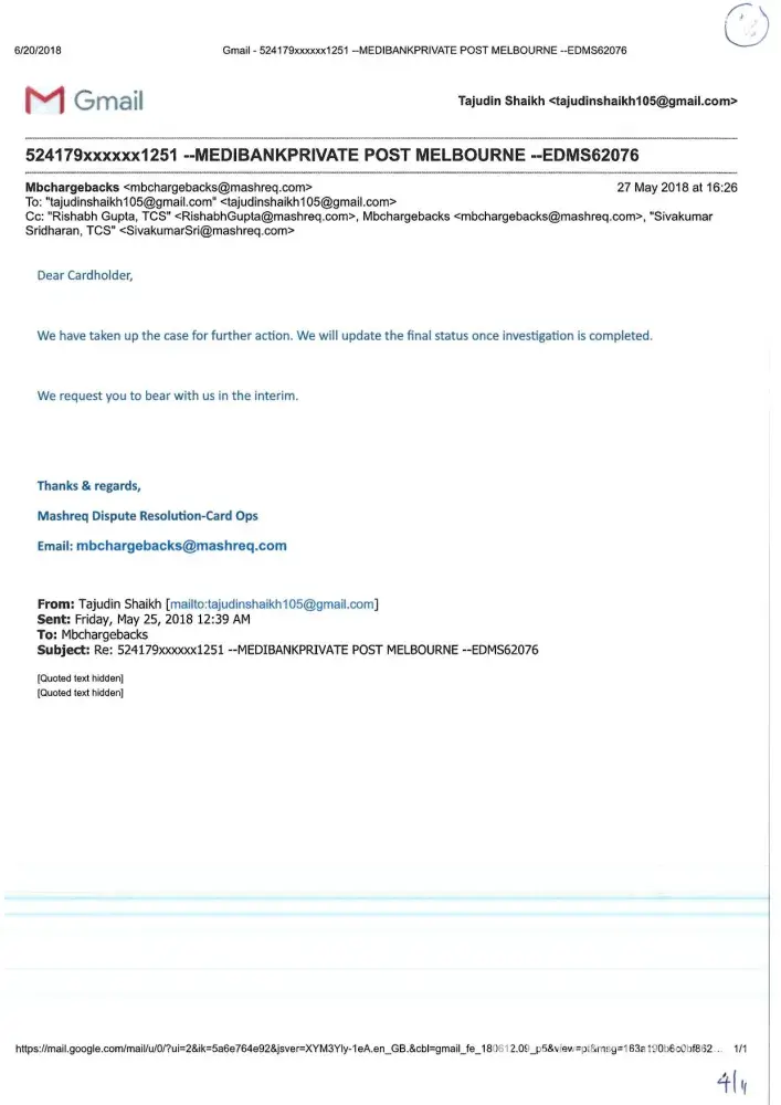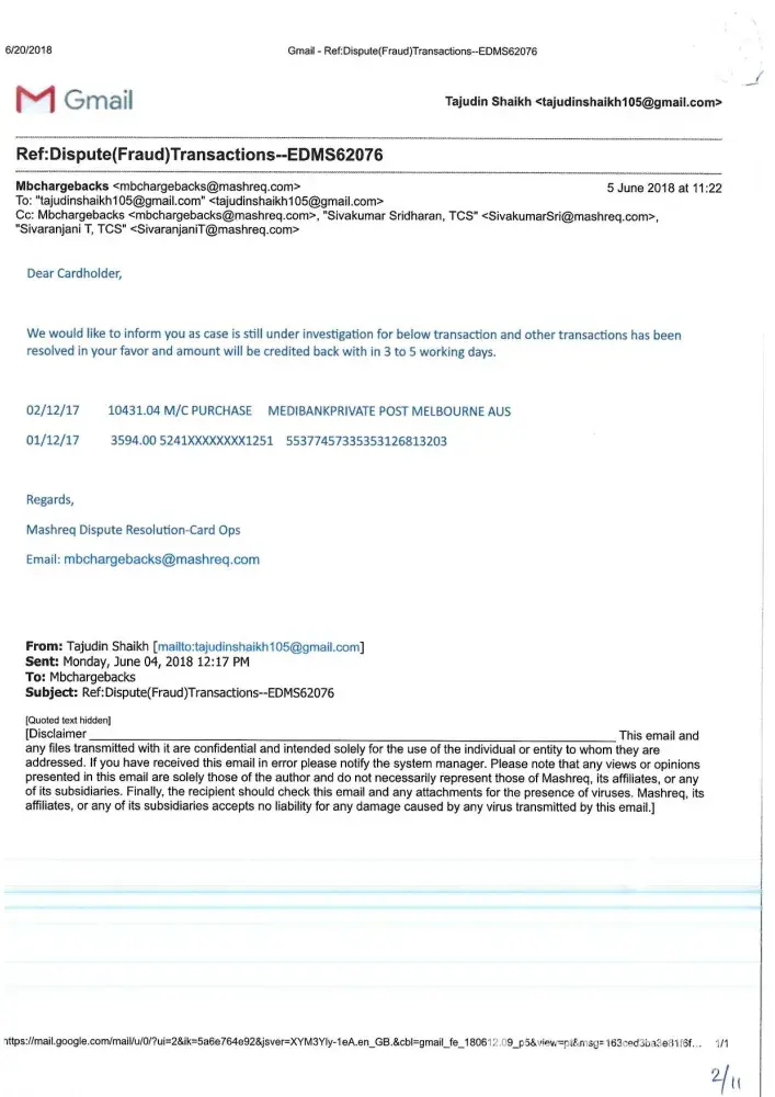 I did not asked Mashreq bank to open in my name any account nor I have done any documentations with mashreq bank related to current account opening. When I called on 04 424 4444, customer care provide me 8003328 number & 800 3328 explained me that credit card collection department have done this. On my one mashreq credit card FRAUD transactions took placed and investigation is still going on with mashreq bank investigating team (mbchargebacks). This investigation team already got Merchant report about these fraud transactions and they asked to fill up another progressive form for further investigation. All these histories collection depart knows very well, despite this, this collection department torturing/harassing me like this and these are not acceptable. Now with these two messages, emails from mashreq bank and supporting documents, I am going to UAE Central Bank, Bur Dubai branch tomorrow to show them about mashreq bank behaviour towards fraud transactions and current account opening and dispatch of cheque book without any documentations/formalities from my side.