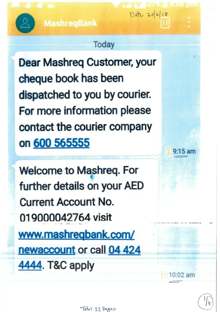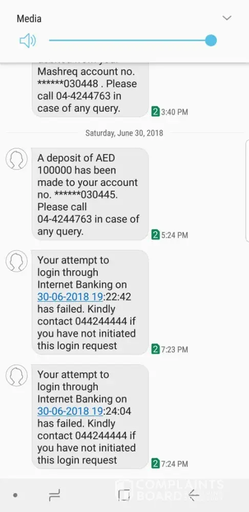 Today (June 20, 2018) morning 9:15am & 10:02am two sms received from Mashreq bank on my registered mobile number. sms are