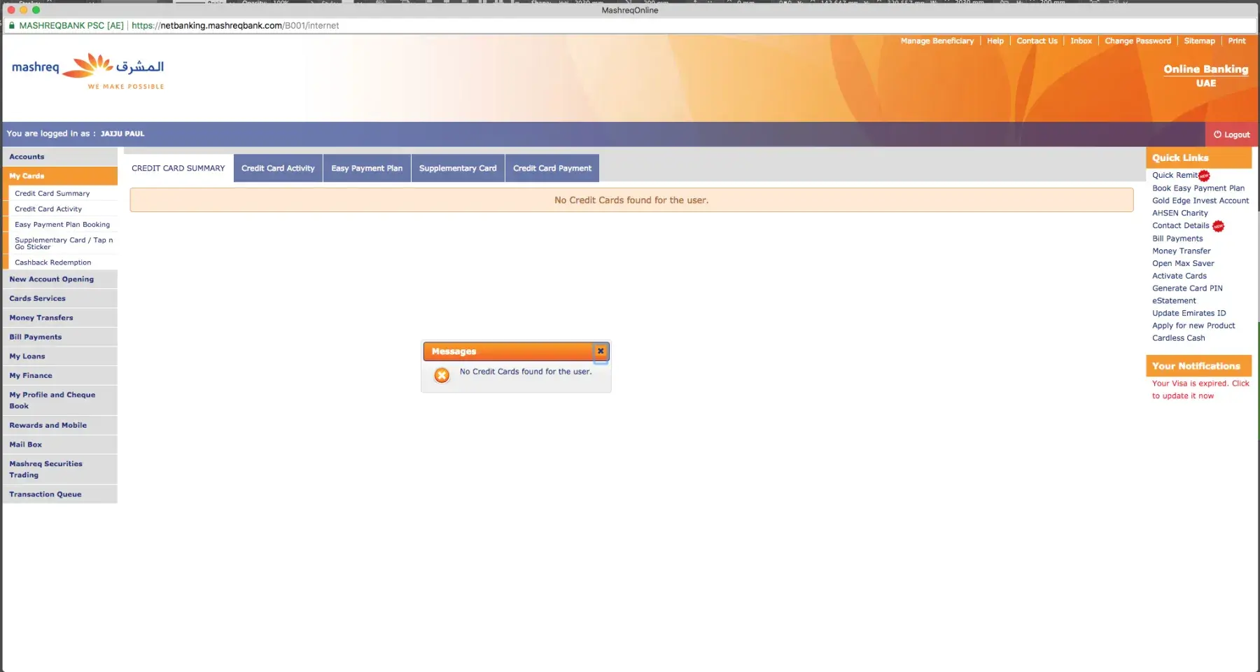 My name is jaiju paul and I had a mashreq credit card and it is not active.