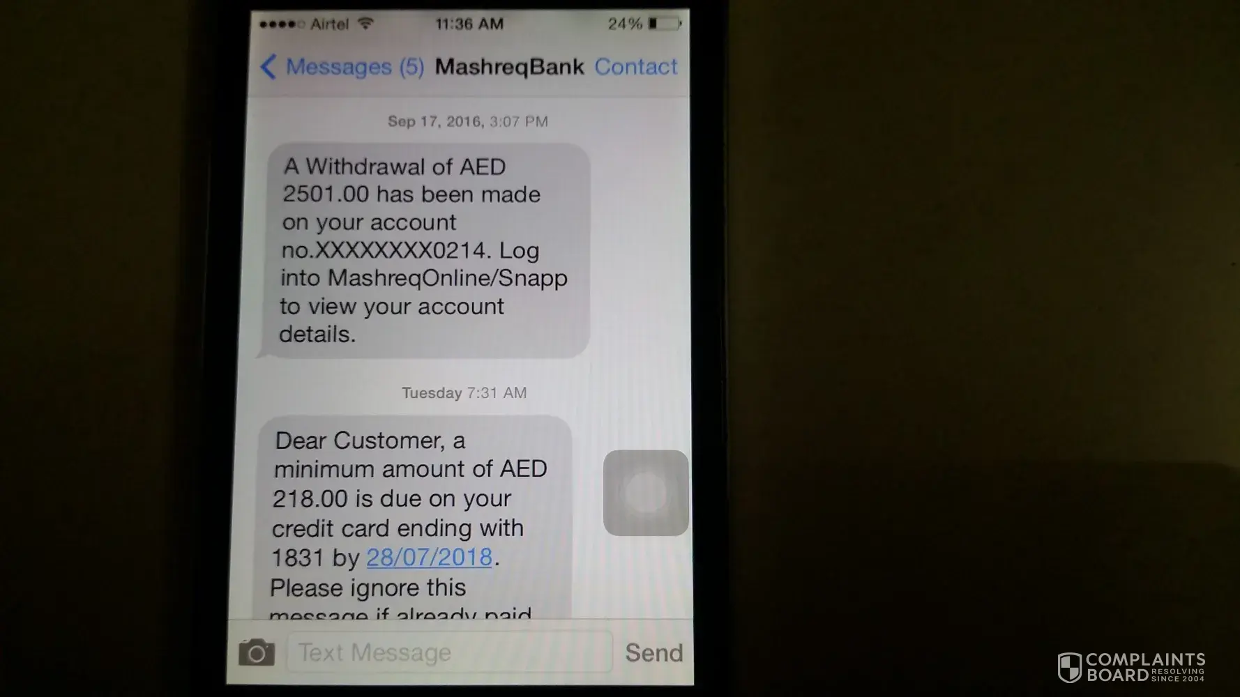 I received a message in my mobile no: [protected] dated on 24/07/2018 stating that minimum amount of AED 218.00 is due on credit card ending with 1831 by 28/07/2018.