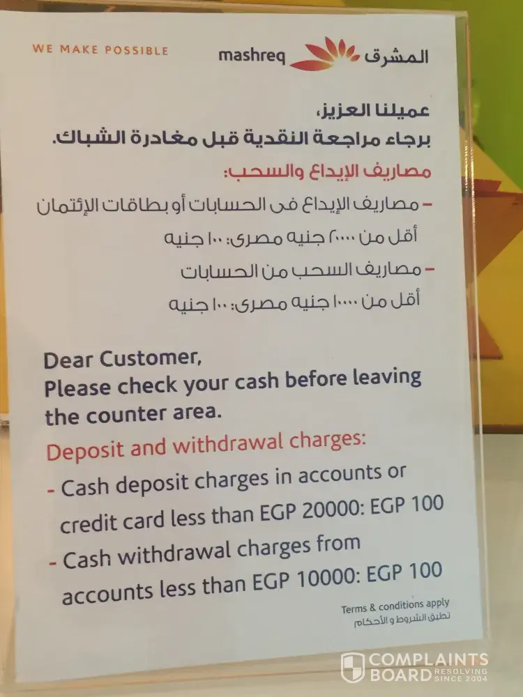 ÙÙŠ جميع ÙØ±ÙˆØ¹ بنك المشرق ÙÙŠ مصر !Ù…ØµØ§Ø±ÙŠÙ Ù„Ù„Ø³ØØ¨ والايداع لا ØÙˆÙ„ ولا قوة الا بالله. كي٠!ØŸ اززاي يعني !؟؟ انظر الصورة المرÙقة !. أي ØØ¯ عايز يعمل أي ØØ§Ø¬Ù‡. لا مشكلة. العميل والمستخدم النهائي والزبون هم آخر اهتمامات بائع السلعة او Ù…ÙˆÙØ± الخدمة. بعكس كل دول العالم. ولا يوجد رقابة من أي نوع. أي ØØ§Ø¬Ø© تقدر تنهشها او تنهبها من المواطن. ÙÙ„ØªÙØ¹Ù„ وتتوكل عل الله لأن Ù…Ùيش ØØ¯ هيقربلك او يكلمك. ابتسم انت ÙÙŠ مصر. 😎👎âŒ