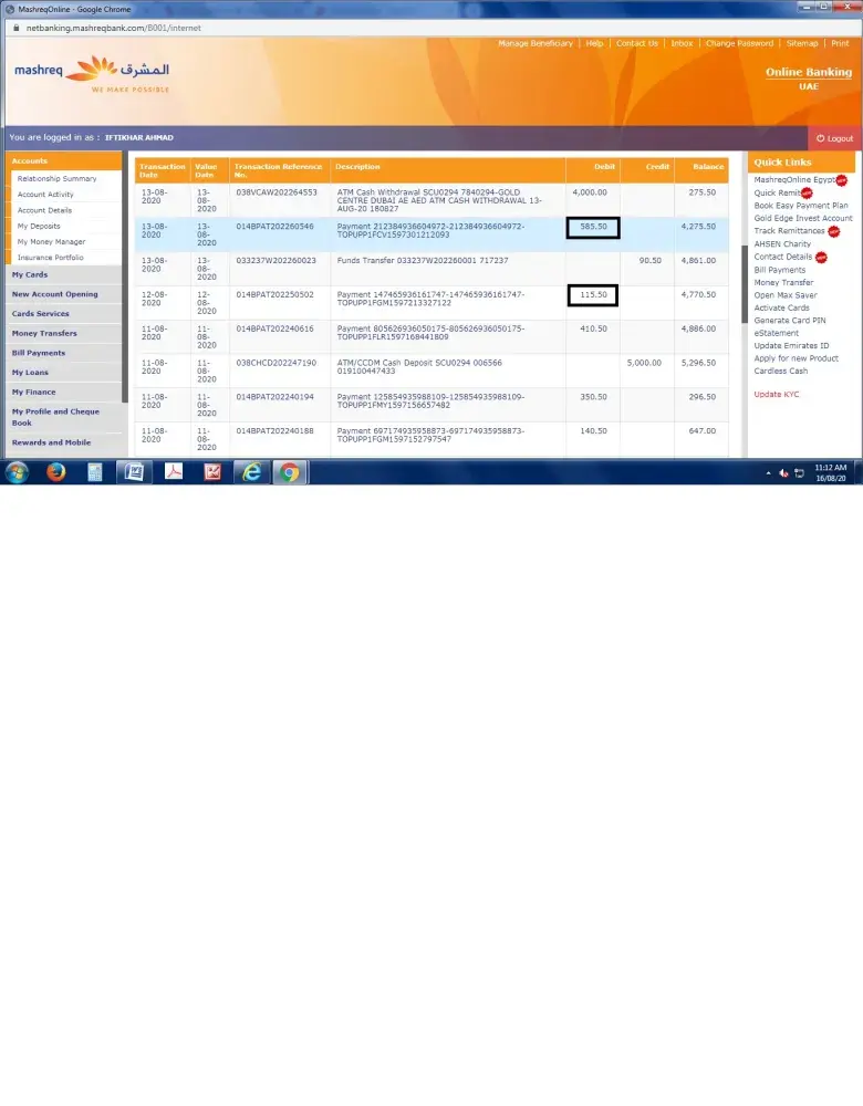 I, IFTIKHAR AHMAD, would like to request you I am account holder of your bank my account No. [protected], I transferred amount AED.585/- and AED.115/- other noqodi account this amount deducted from my account but not received this amount in noqodi account please check and solve my problem as soon as possible