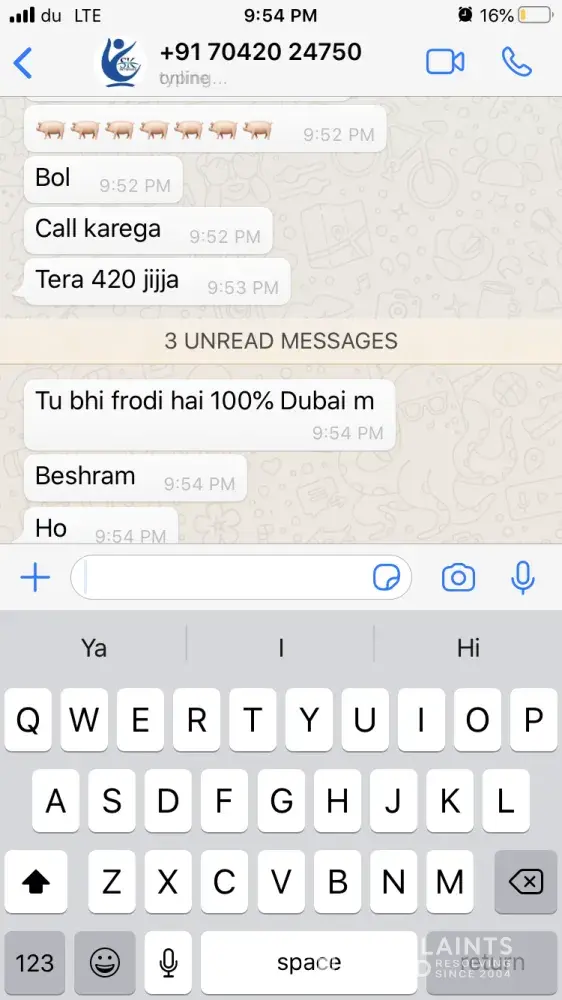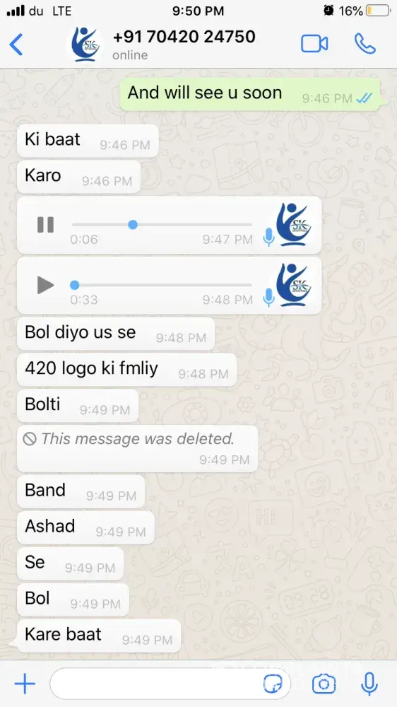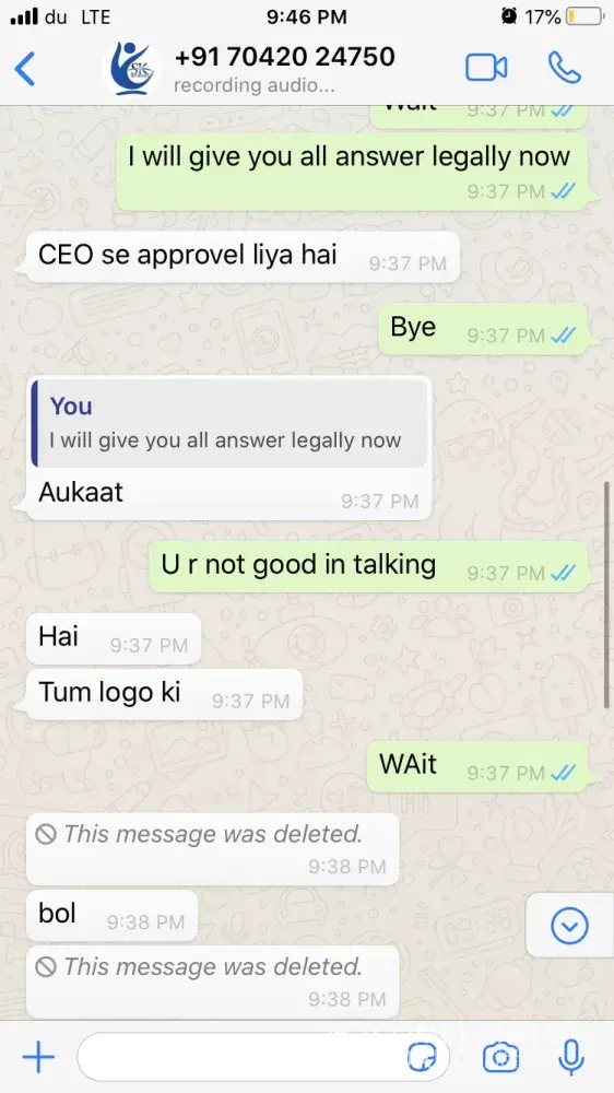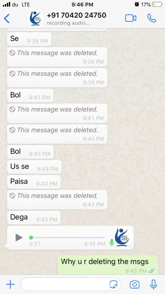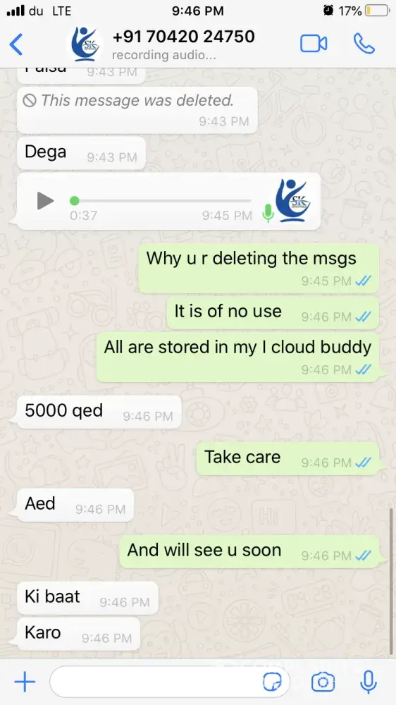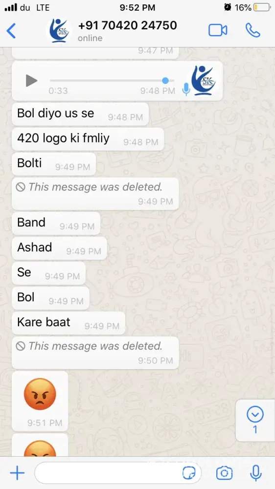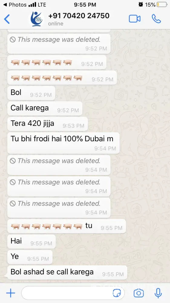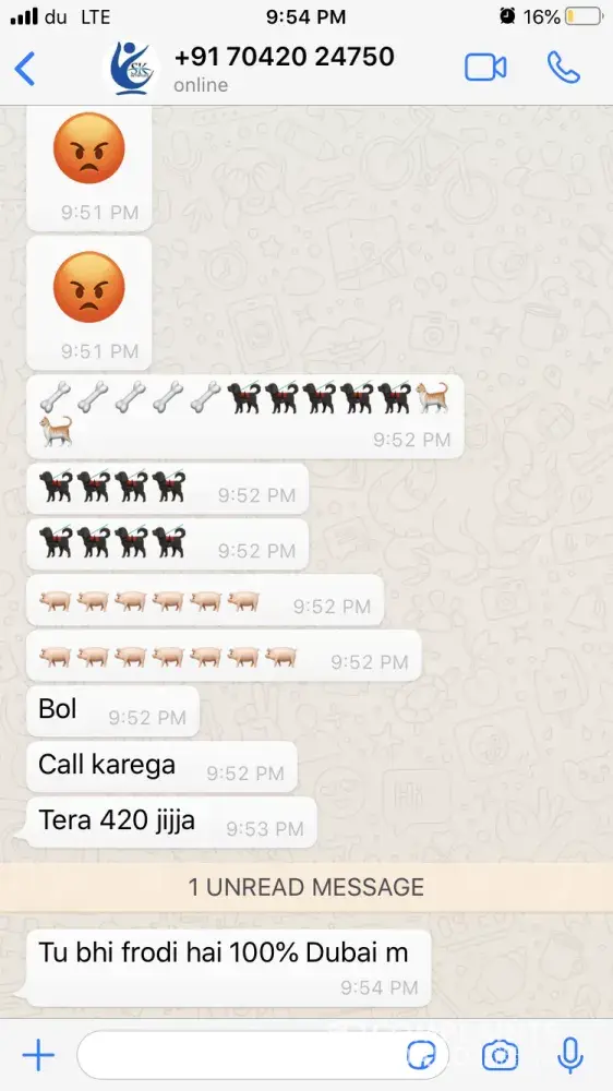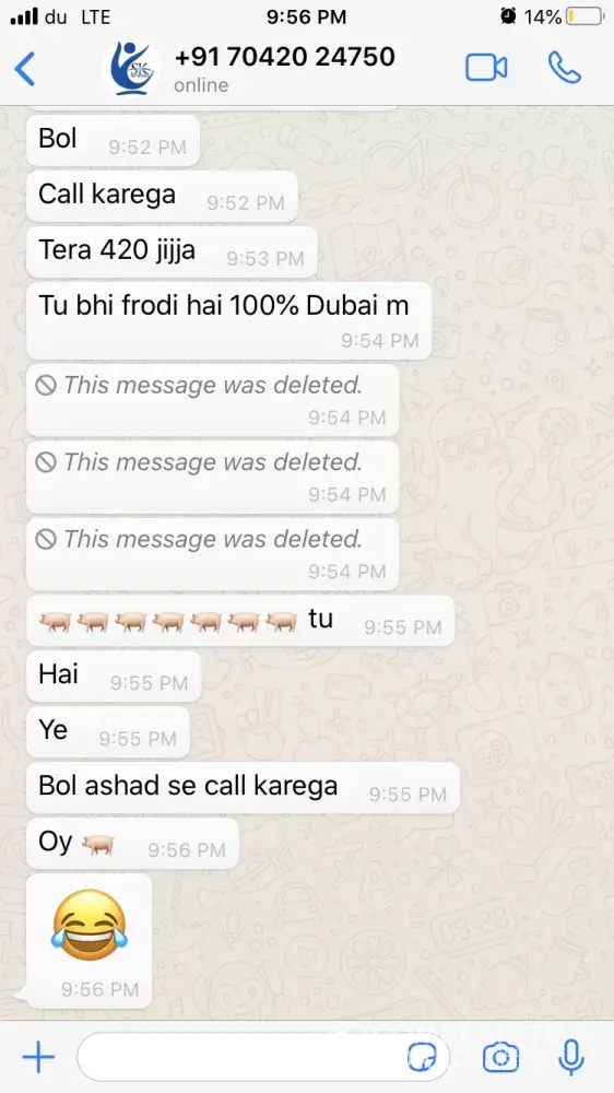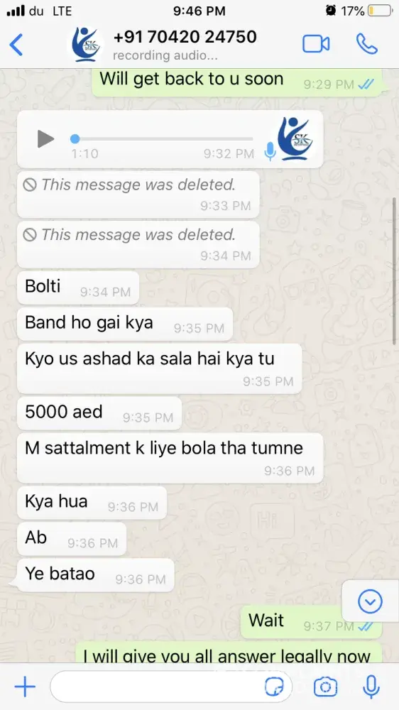 One of the agents from India has sent me whats app chat & voice messages (Attached) which are very abusive and shall not be tolerated by any means. Hence I request Mashreq bank to take strict action on this matter. Moreover I will be approaching the local authority and Indian consulate to look forward to this issue to give me justice as I have been insulted very badly where I am not guilty as I was trying to resolve the issue between the bank and my brother.