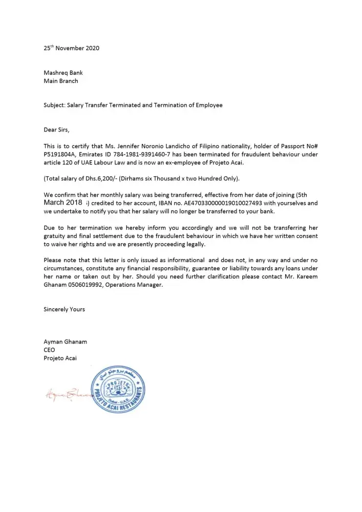 An ex employee of our company is an account holder of Mashreq bank, iban number470330000019010027493 Jennifer Noronio Landicho filipino passport holder no. P5191804A for fraudulent behaviour and theft of thousands of dirhams. We want to notify you and send the letter to you. We will not be responsible for any loans she may or may not have. We are alerting you to her misconduct. She is an ex employee of Projeto Acai. We will cancel her visa and as per labour law she is not recipient for end of service (EOS) which she has waived. Regards Mr. Ayman Ghanam CEO of Projeto Acai.
