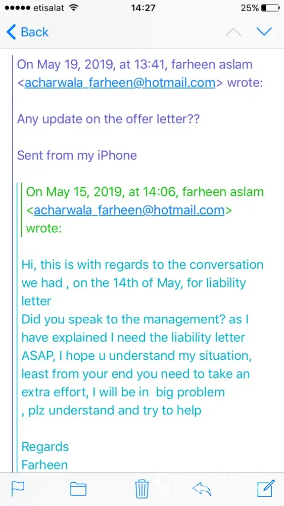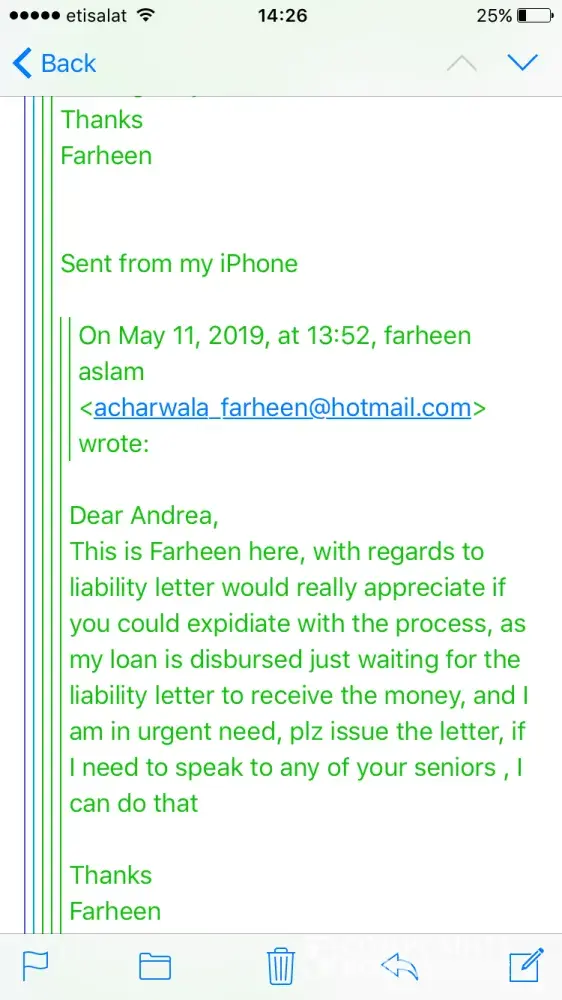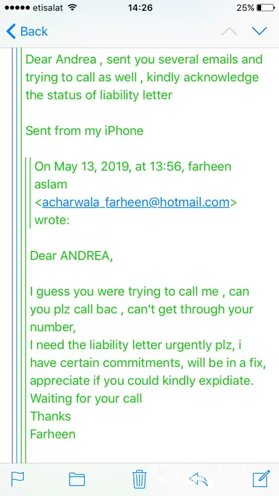 I have an account with mashreq bank, wanted to top up my loan, however the rate of interest was much higher so moved to another bank, the bank employee from the retention team had called and made an offer, as I have already proceeded with my loan dint accept the offer and requested for a liability letter, had submitted the offer letter on the 5th of May, the staff initially told me 15 days, then later 15 working days, however since these 15 working days I have sent her several emails (Andrea D'Souza) and made several calls explaining my urgency, but this lady does not respond