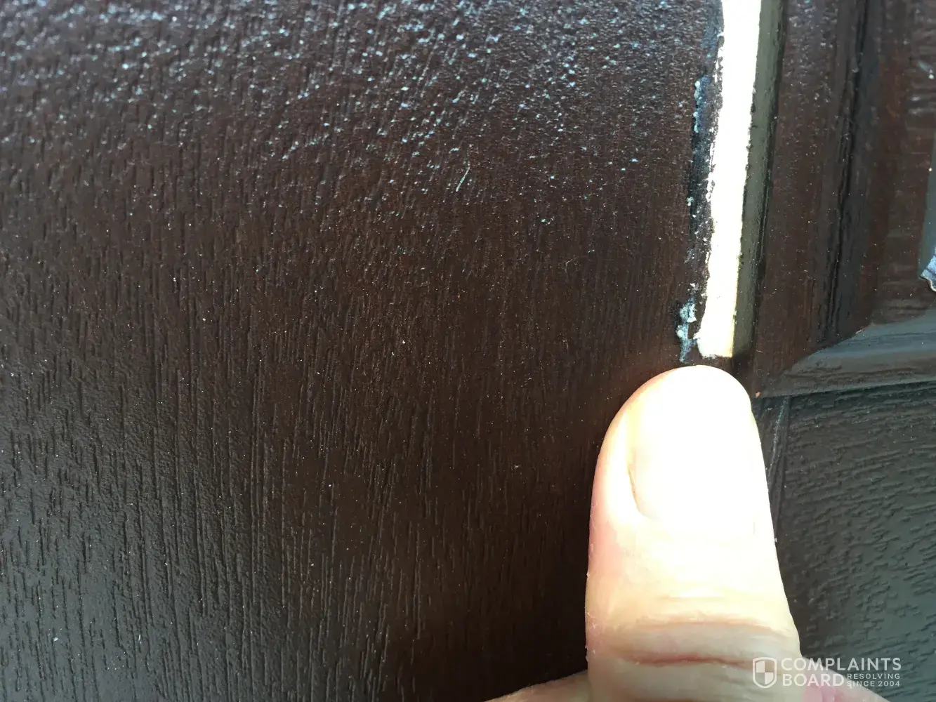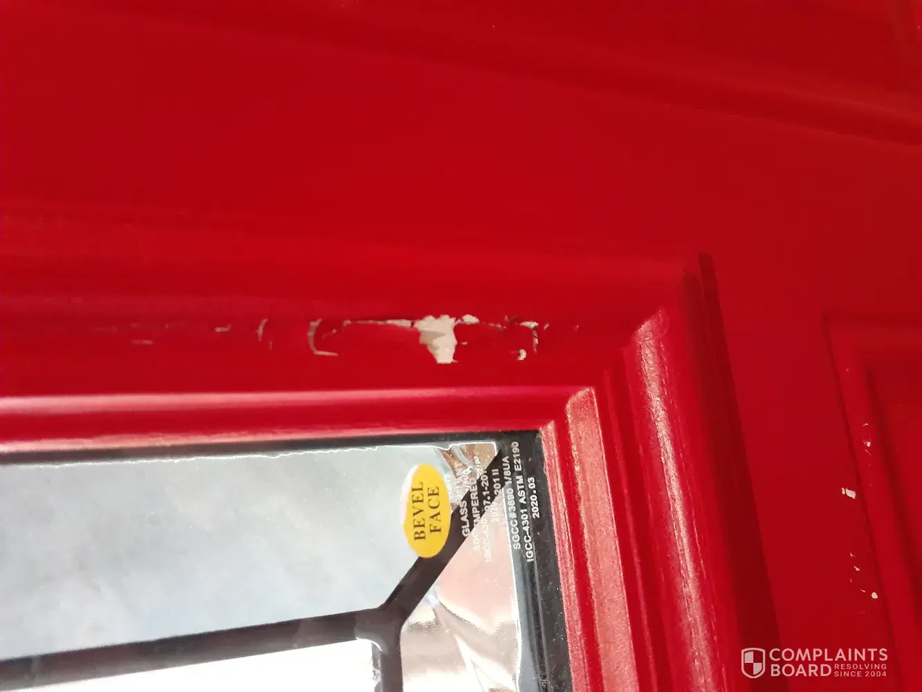 I'm having two problems with my Masonite door. 1. there appears to be adhesive creeping out from around the window and 2. there seems to be a "chalky" substance that randomly appears on top of the paint. The chalky stuff wipes off, but it comes back in about a week and makes the door look "comoflauged" from a distance. The customer is unimpressed... Masonite customer service has yet to even respond to my concerns.