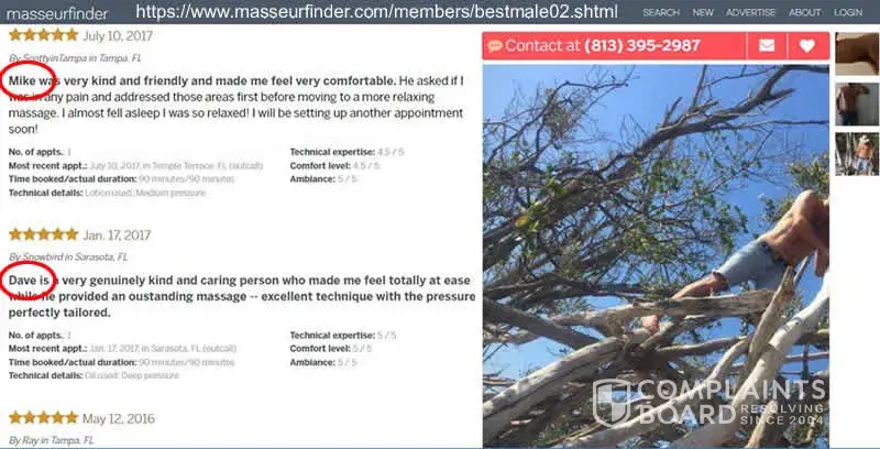 The first attached screenshot pic would prove the names "Dave" and "Mike" were used by the SAME person. Currently on his MFinder ad, look at the reviews - the name "Mike" was used on the 7/10/2017 review. The name "Dave" was used on 1/17/2017 review.