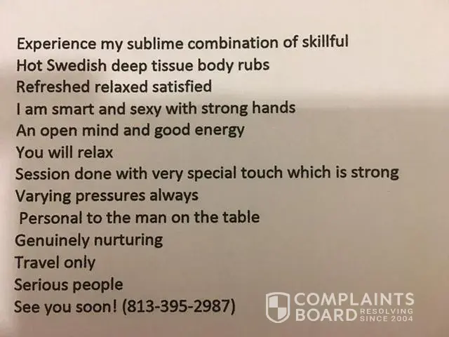 As an internet sleuth wannabe, I took the time and did a deep dive and was able to find the following information about this "masseur/escort". Basically I began with a reverse picture search and was able to find multiple phone numbers used by this guy through the years, all the way back to 2014: