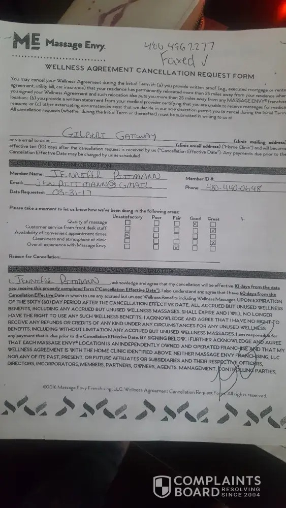 I went to the Superstition Gateway location to use my last massage credit up. On 03-31-17 the staff there helped me with the cancellation request form. It was faxed to the San Tan Village location.Â