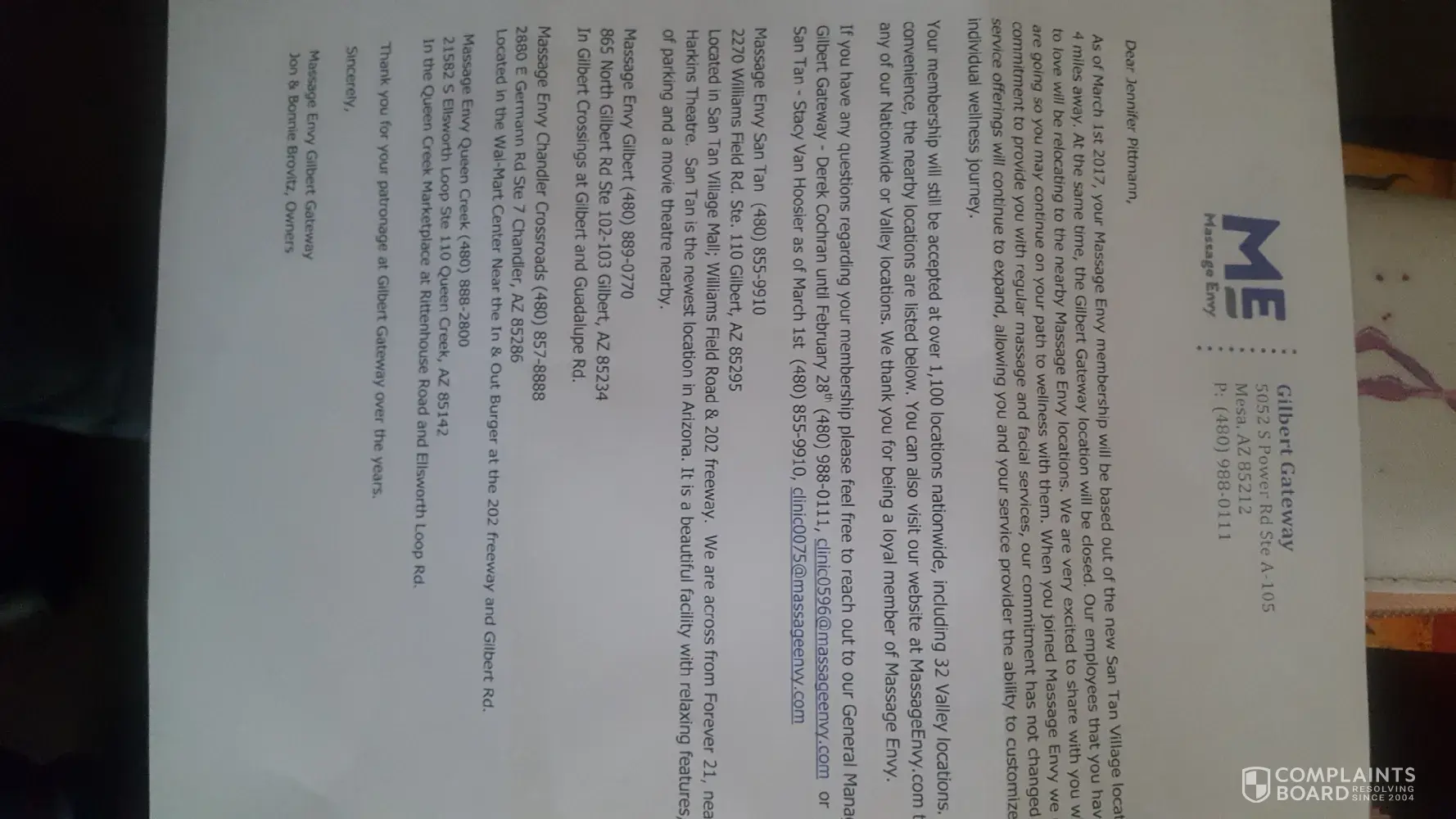 My name is Jennifer Pittmann. I had a membership with Massage Envy at the Gilbert Gateway location. I received a notice that it was going to be closed. I received a letter that stated as of 03-01-17 my Massage Envy Membership was transferred to the San Tan Village. I tried that location once. This location is far for me and not very convenient.