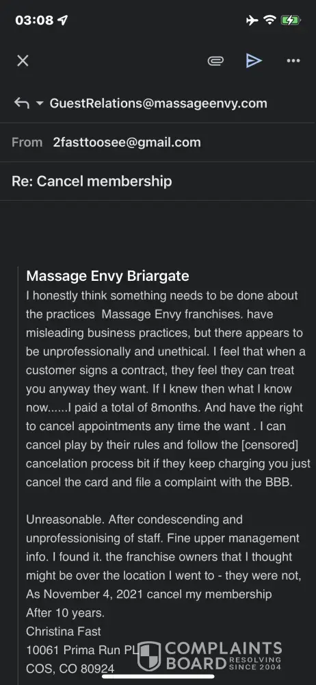 Massage Envy Briargate honestly think something needs to be done about the practices of Massage Envy franchises. Have misleading business practices, but there appears to be unprofessionally and unethical. I feel that when a customer signs a contract, they feel they can treat you anyway they want. If I knew then what I know now... I paid a total of...
