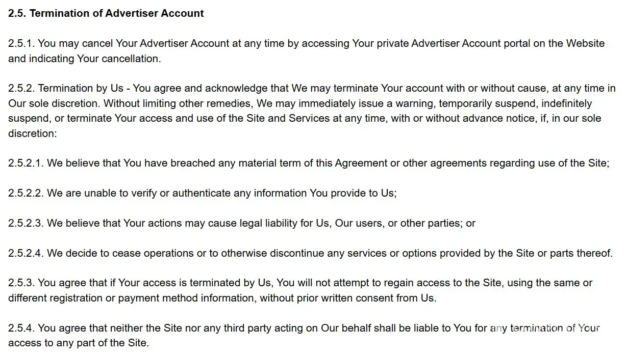 How is one meant to request written consent from you prior to one's attempt to regain access to the site? Clearly such consent exists, as it is mentioned in the Advertiser Agreement, in section 2.5.3.