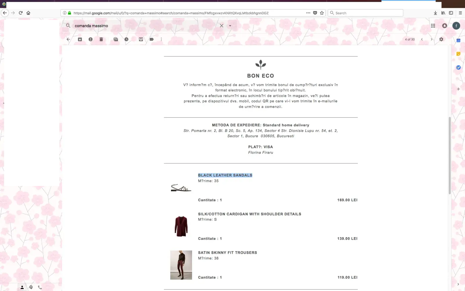 I am writing in connection with the on-line order no. [protected]. As it can be checked, I bought a pair of black leather sandals and I am completely disappointed of the product. After 3 wears they still cause me serious ankle injuries. Also, their stripes are still very rigid, reason for which they cause a big pressure on the foot. I am used to shoes causing small injuries during the first time of wearing, but these sandals are, in essence, impossible to wear, though I tried and I am not giving up easily.
