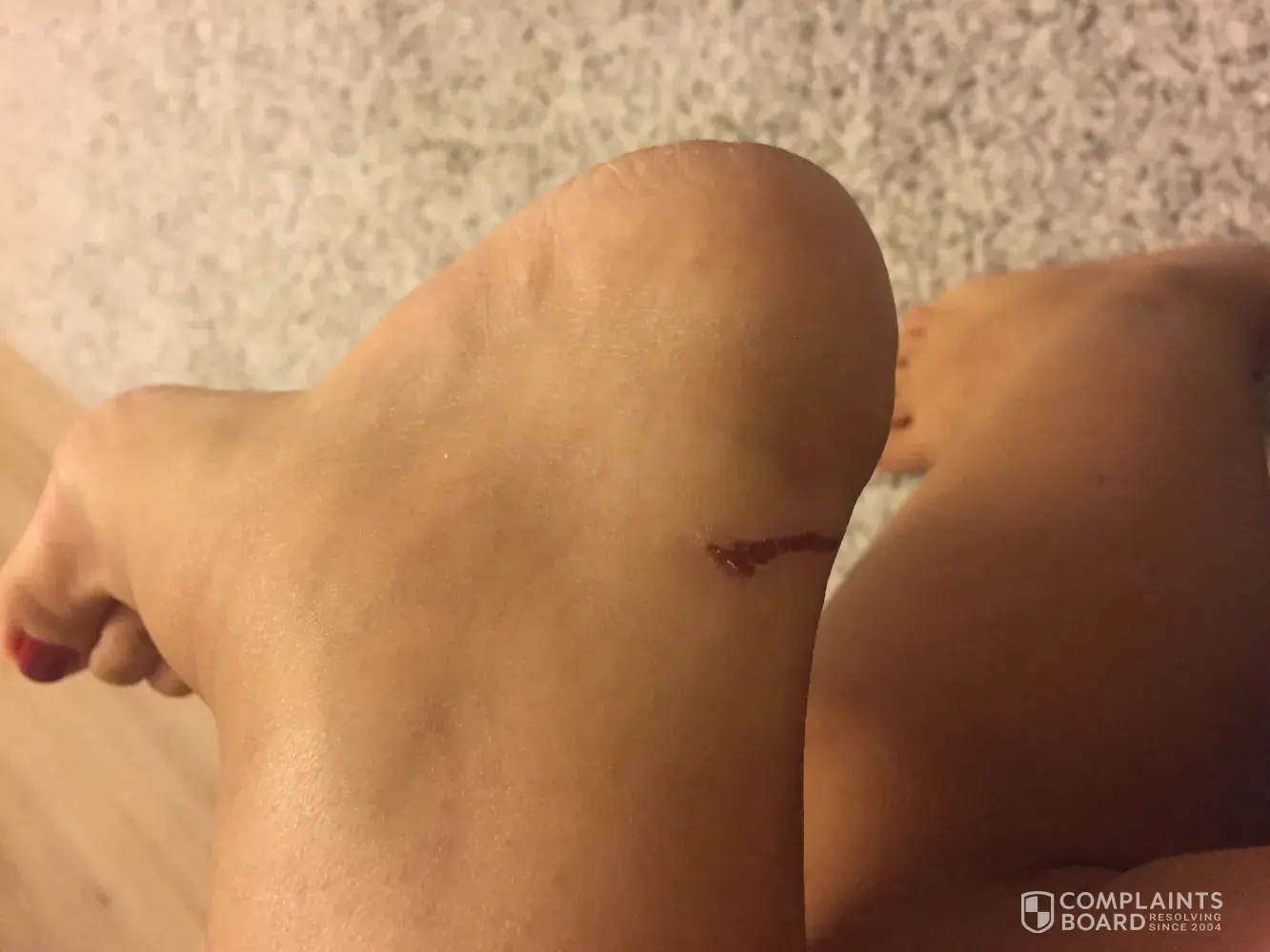 Attached I am sending the electronic receipt, photos of the sandals and photos of my ankle with injuries after one-week break from wearing the.