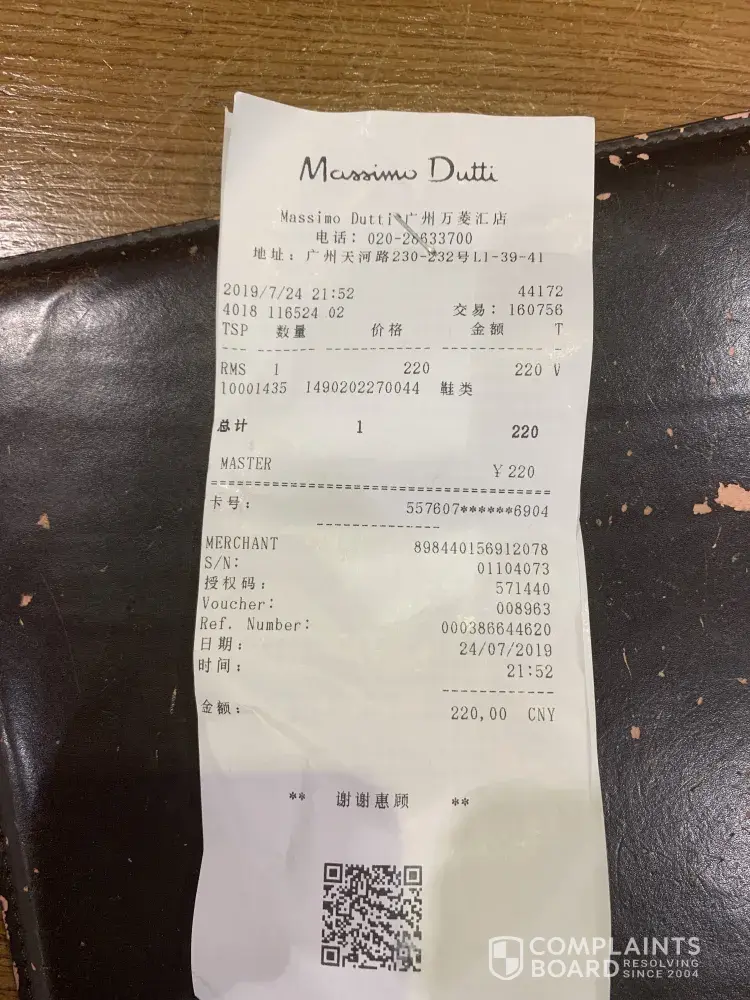 I am not chines I travel her and my all cloth formal or casual from Massimo so I go to buy shoes using my credit car from the store Unfortunately the shoes I walk with one day only and broken the like photo attach so I take back to store and they say must wait 30 day to take back money ! And this only the way they can solve, my how I can wait all this time and I will come back my country after tomorrow and why after I buy and using my credit which have bank Commission they don't want give me on time why must wait !