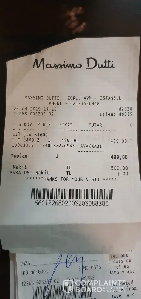 unfortunately they couldn't help me beacuse the comapy who operates here is different to the one in Istanbul, so now am sending this message beacuse I just feel so mad that I paid almost 100$ for nothing as am going to throw the shoes away as there is no way I can use it and I want from Massimo Dutti to find me a solution for this problem. Although the shoes wasn't inside its box it was in another shoes box. I have attached pictures of the shoes.