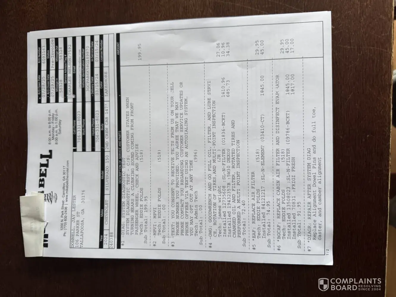 The basic left the alignment pins out of my truck and it starting knocking and I had to get Chevy to fix it and it cost 680.00 to fix. The tech was negligible and I am not taking the 130 refund for alignment. I have tried contacting the training manager and no response. I am prepared to move forward if I don’t get a satisfactory outcome. This is the...