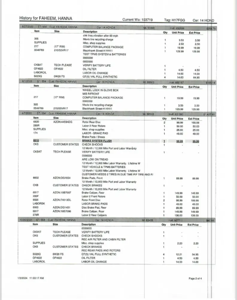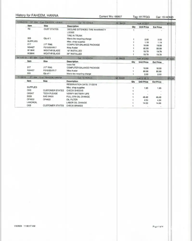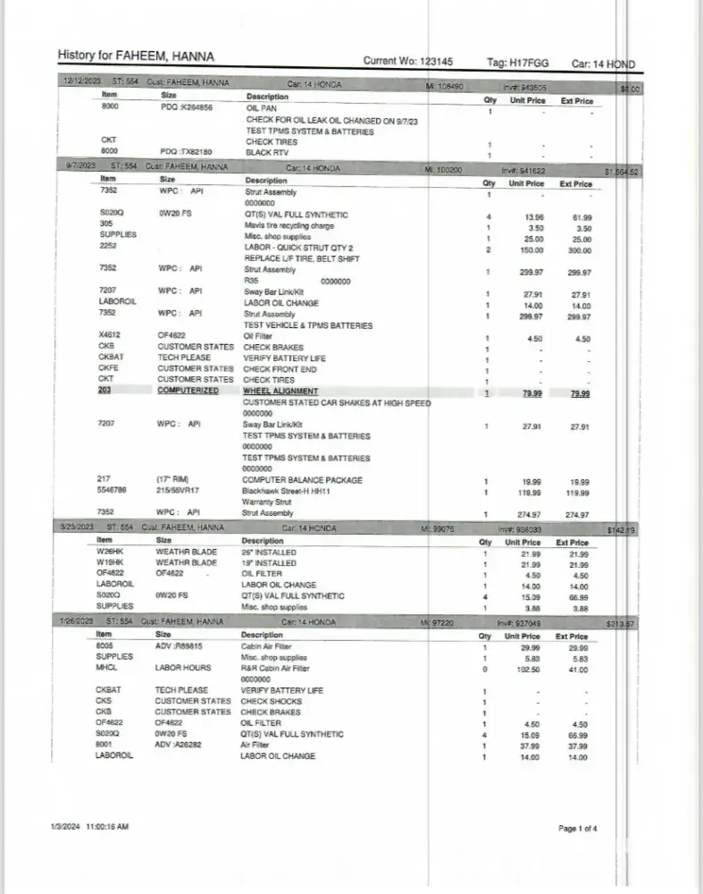 To Whom it May Concern, My name is Hanna Faheem, and I am reaching out regarding a situation that took place at the Mavis store located on 442 Elizabeth Ave in Somerset, New Jersey on September 7, 2023. I brought my 2015 Honda Accord to have one tire changed, an oil change, an alignment, and struts replaced. I paid for $1,664.00 for these services (see...